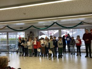 Les écoliers sont venus par groupe de classes, chacun ayant préparé un chant ou deux, d’abord les CE1-CE2 puis les maternelles et CP pour terminer par les CM1-CM2. Les plus jeunes avaient réalisé des dessins qu’ils ont offerts à leurs aînés. Les résidents, réunis par l’animatrice Marie-Christine Cancian et sa stagiaire Pauline Fegly, étaient ravis de cet après-midi festif et ont repris en chœur le « Petit Papa Noël ». Les enfants ont ensuite invité ceux qui le souhaitaient à venir prendre un goûter à l’école.