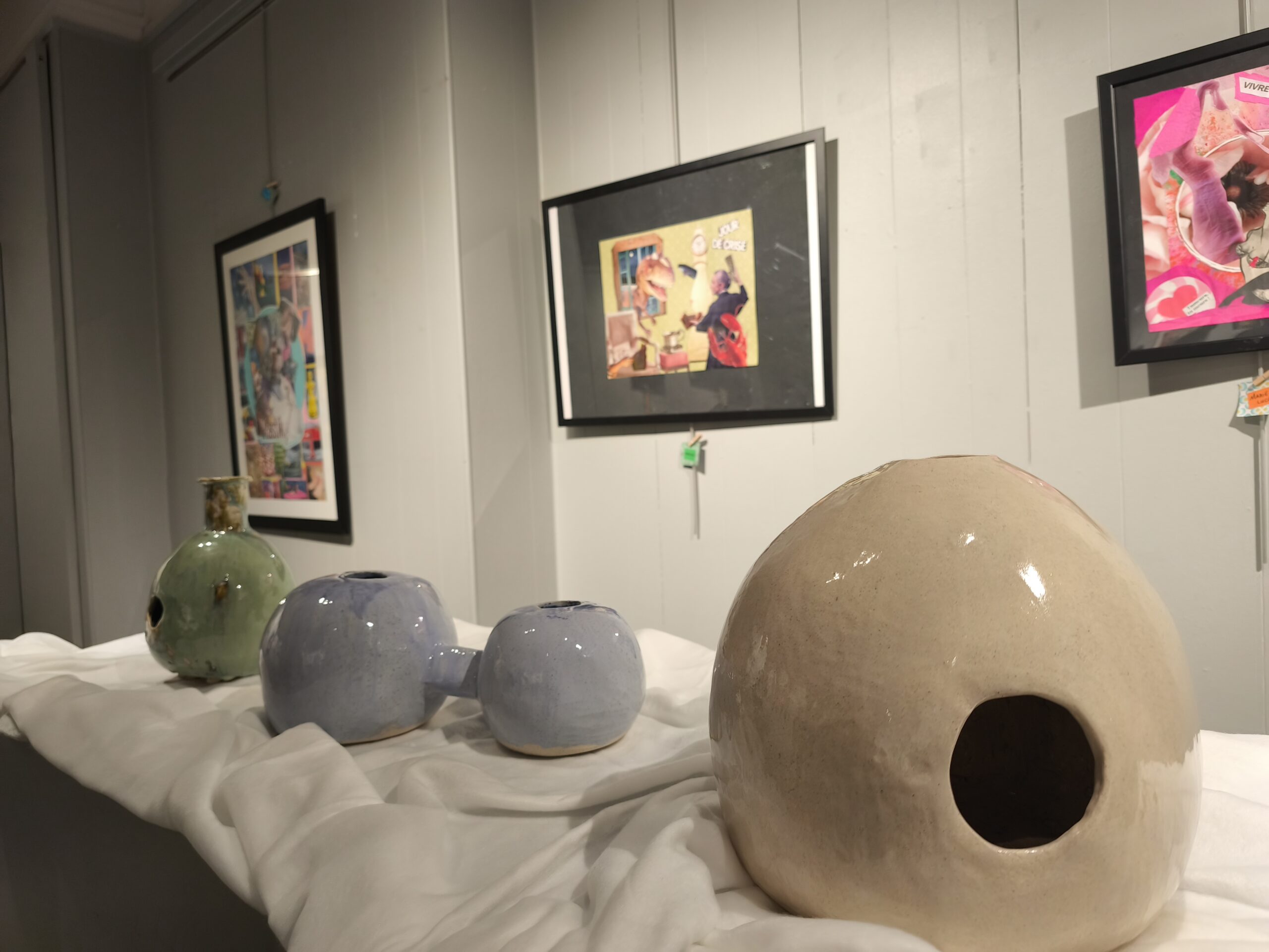 Céramiste depuis deux ans et installée à Xonrupt-Longemer, Anne Fautsé anime quant à elle l’atelier poterie, principalement destiné aux enfants pour la découverte de cette activité. Dans son atelier où elle s’est équipée d’un four il y a un an et demi, elle accueille également des adultes et, à l’occasion de cette toute première exposition, vous retrouverez donc des créations de l’ensemble de ses élèves, mais aussi une partie de son travail personnel. Petite originalité, on signalera ainsi l’exposition de udus, percussions idiophoniques (qui produisent du son par elles-mêmes) originaires du Nigéria et qui, en igbo, signifie « vaisseau ». En travaillant avec un percussionniste, l’atelier a pu créer plusieurs formes et tailles pour obtenir plusieurs sonorités différentes…