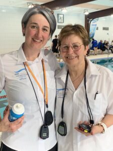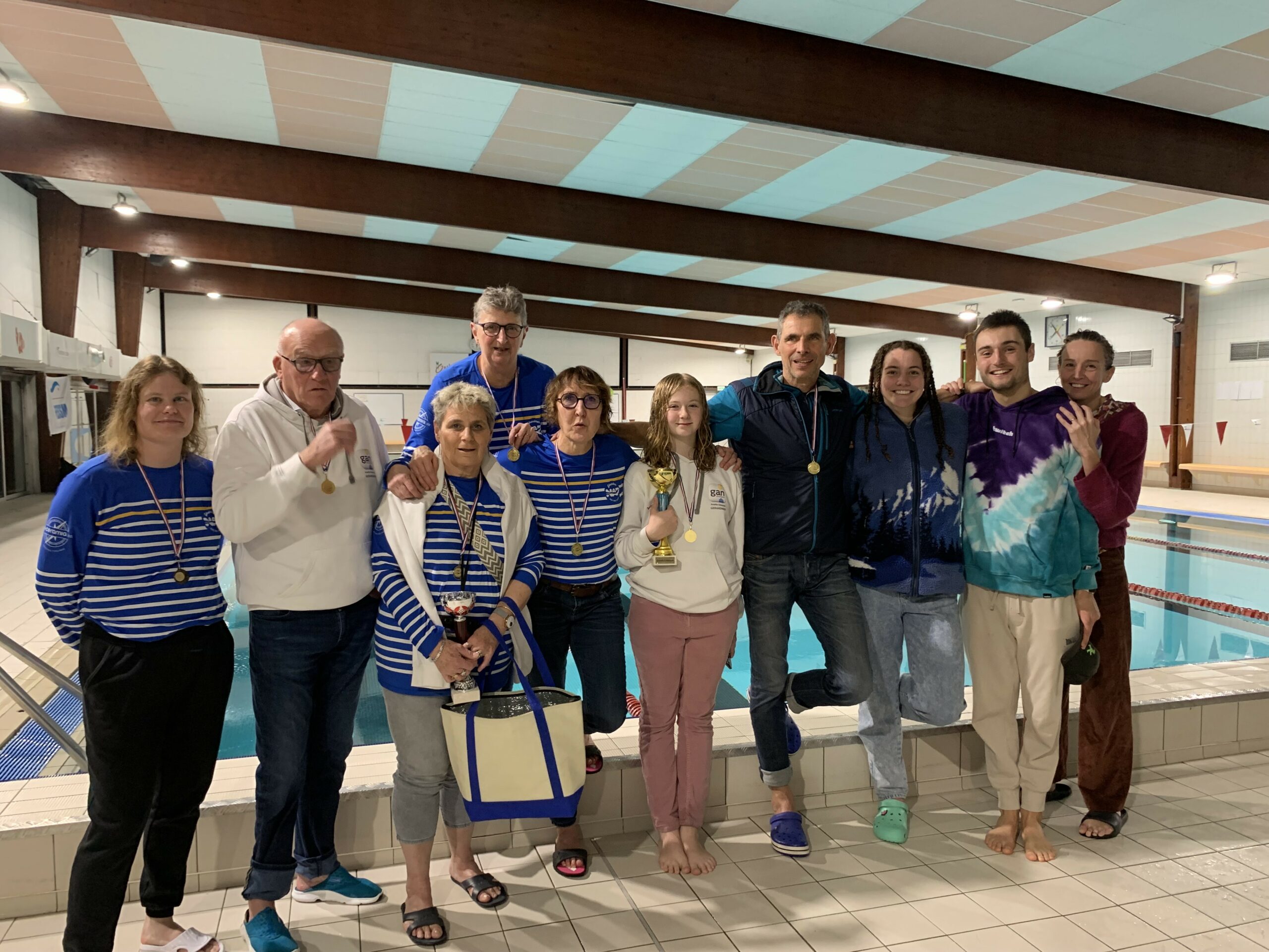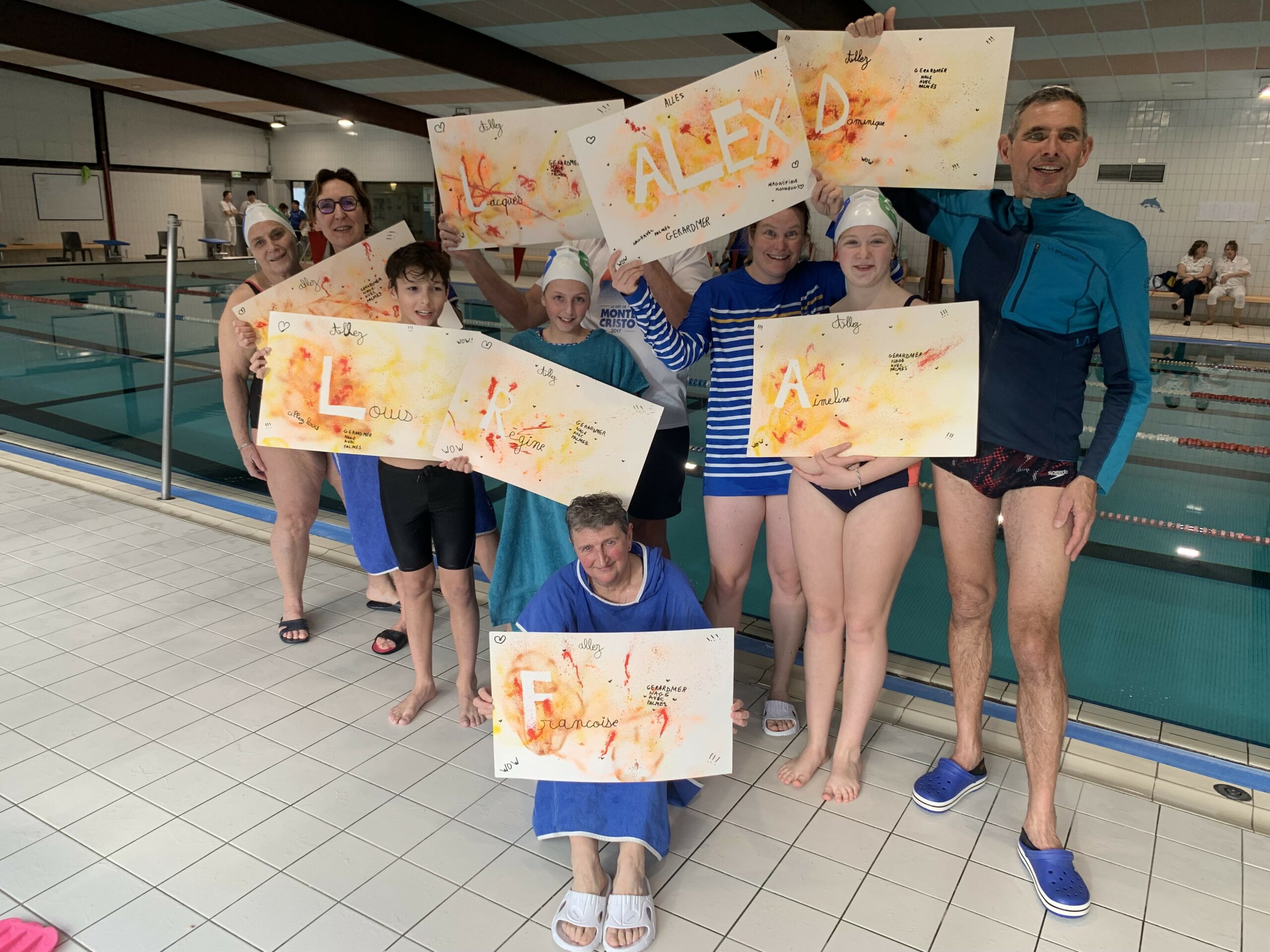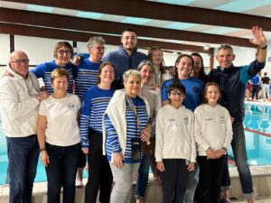 Les deux juges du jour pour le club gérômois étaient Patricia et Sandrine. Côté résultats, on retiendra une belle première place chez les minimes pour Aimeline, Violette ayant déclaré forfait. Elle a tout de même pu terminer un 25 m apnée et un 800 m, Louis termine 4e minime après avoir fait de très belles courses. Côté masters, des premières également places pour Valérie Georgeon, Françoise, Dominique et Jacques Leléon, ainsi que des médailles d’argent pour Alexandra et Régine. Une très belle journée qui a permis de renforcer une belle cohésion au sein du club, avec en plus de belles affiches réalisées par Violette, supportrice au top. A noter que Régine et Jacques ont également été récompensés car ils étaient aussi les doyens de la compétition.