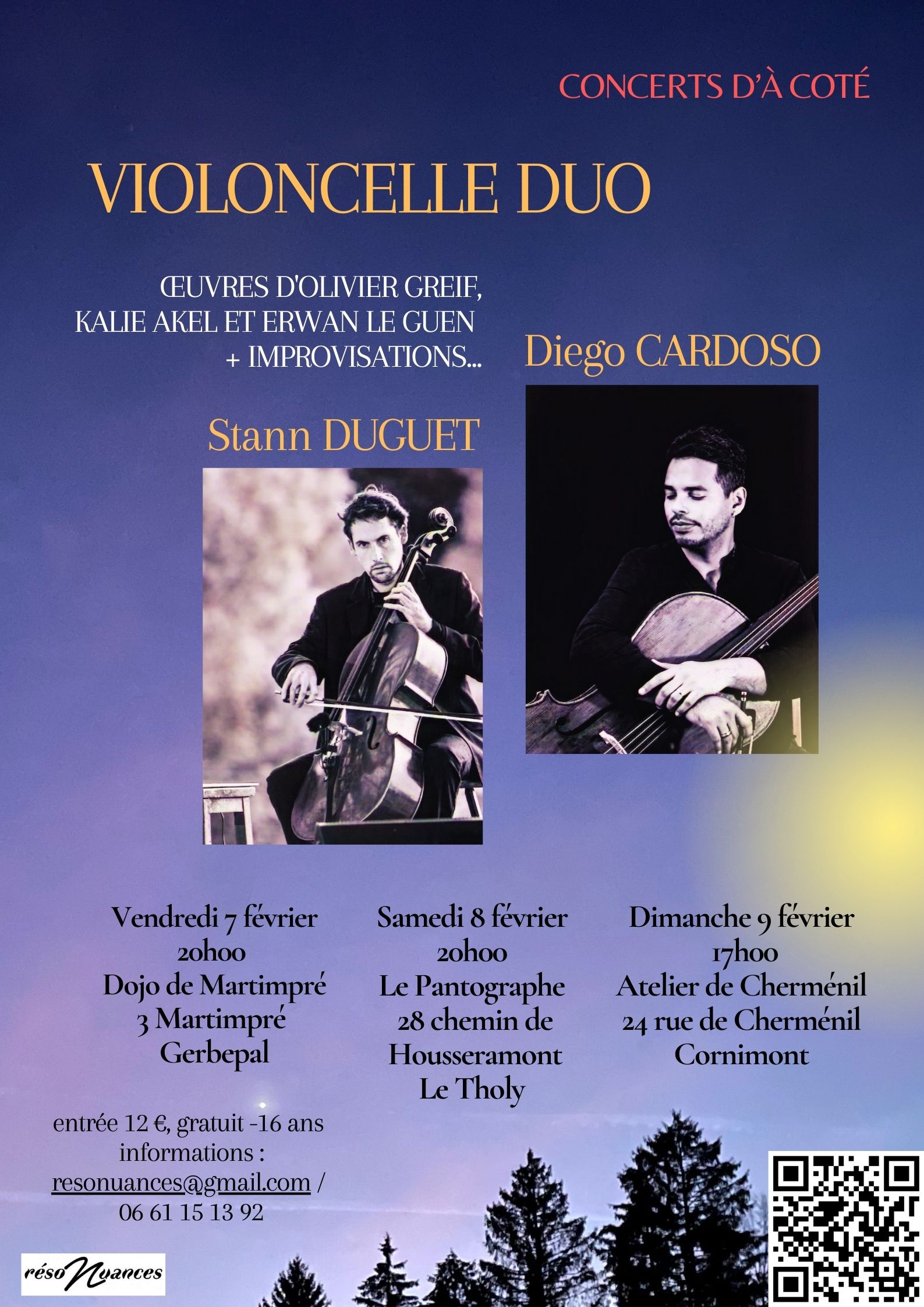 Ils forment un duo saisissant, où interprétation et improvisation s’entrelacent pour donner vie à une aventure musicale intense. À travers un répertoire audacieux, ils présentent des œuvres inédites de Kalie Akel et Erwan Le Guen, spécialement composées pour eux, et réinterprètent une pièce d’Olivier Greif, The Battle Of Agincourt. Chaque composition, marquée par des thèmes tels que la mémoire, la lutte intérieure et la renaissance, se transforme en un dialogue sonore captivant. Portés par une complicité remarquable et une énergie sans limites, les deux violoncellistes repoussent les frontières de leur art. Chaque concert devient une expérience unique, où la musique jaillit, imprévisible et immersive, plongeant le public dans un univers d’émotions et de sonorités vibrantes.