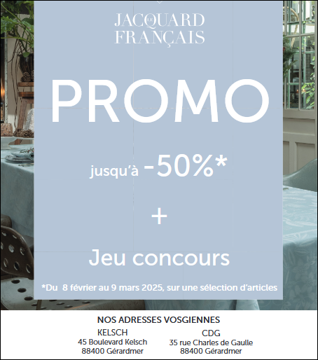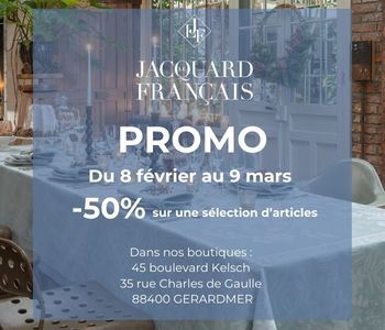 Jusqu’au 9 mars 2025, profitez de réductions exceptionnelles jusqu’à -50% sur une sélection de linge de table, de cuisine, de bain et la décoration, dans nos deux magasins d’usine de Gérardmer.