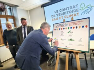 C’est à la salle de l’Horloge que la signature a eu lieu en présence des représentants des organismes signataires ainsi que de Mme la préfète des Vosges et de M. le sous-préfet de Saint-Dié-des-Vosges. Antoine Planquette. Premier à prendre la parole en préambule de la signature, le président de la CCGHV Stessy Speissmann Mozas a rappelé brièvement que le contrat de territoire Eau et Climat «Ensemble, préservons notre ressource en eau et nos lacs » se concrétisera notamment par 35 actions retenues pour un montant de 17,6 millions d’euros, dont 9,3 millions d’euros d’aides de l’Agence de l’eau Rhin-Meuse. Parmi les actions inscrites au contrat, la protection annuelle de 10 hectares de milieux naturels. C’est donc un engagement fort pris par les élus et l’ensemble des signataires, « une étape importante pour le territoire, (…) un défi important à relever avec l’État à vos côtés, (…) un nouveau chapitre pour les Vosges » a déclaré Valérie Michel-Moreaux, soucieuse de rassurer les représentants de la communauté de communes sur le soutien de l’État dans cette démarche « exemplaire » et ambitieuse.