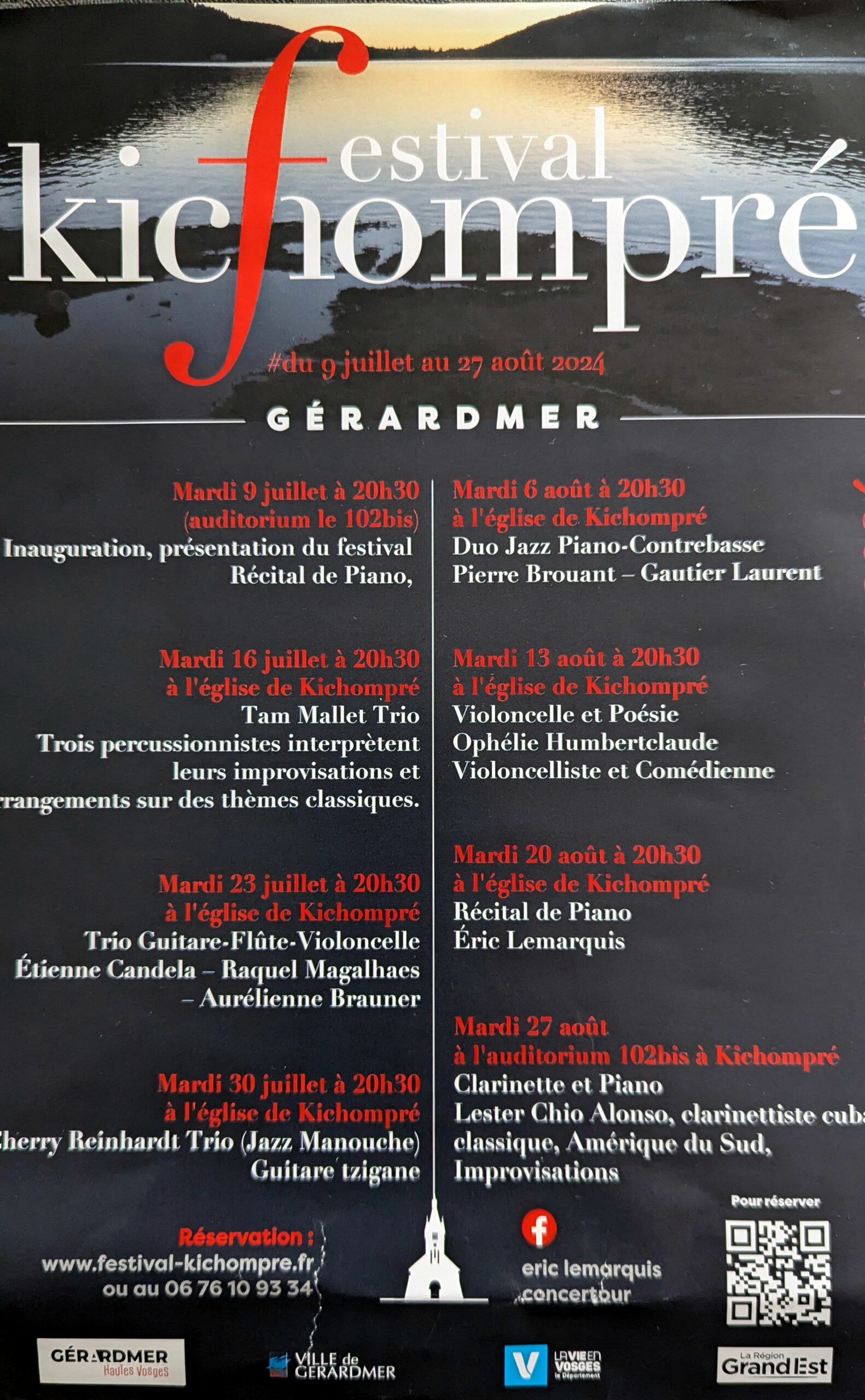 Après une période difficile qui résultait de la crise sanitaire, le festival de Kichompré/Gérardmer est désormais soucieux de renouer avec les grandes heures passées depuis 1989. Pour cela, il se donne les moyens de ses ambitions avec une programmation dense et de qualité : le répertoire classique reprendra ses droits avec des solistes de renom comme Etienne Candela, Raquel Magalhaes ou Aurélienne Brauner. Vous retrouverez également certains artistes qui ont contribué à faire l’histoire de Kichompré comme le clarinettiste cubain Lester Chio Alonso qui clôturera le festival, ainsi que Pierre Brouant de retour avec un nouveau duo jazz piano-contrebasse. Vous découvrirez également des musiciens invités pour la première fois comme le Tam mallet Trio et Ophélie Humbertclaude, et enfin des pointures du jazz avec Gautier Laurent ou le Cherry Reinhardt Trio.