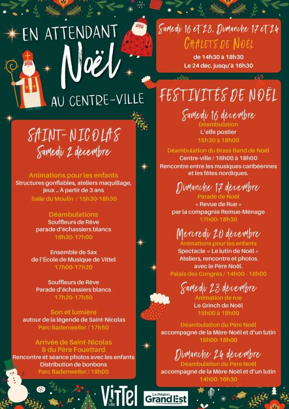 •Lundi 4 décembre : Saint-Nicolas rendra visite à nos petits et à nos aînés – 9 h 45 : école maternelle du Petit Ban- 10 h 30 école maternelle Louis Blanc- 11 h 45 : restaurant scolaire – 14 h 30 : maison de retraite Petit BAN- 15 h 15 : résidence A.I.R.Des festivités jusqu’à Noël : Pour faire patienter les Vittelloises et Vittellois, ce mois de décembre sera rythmé par des animations variées allant des parades festives aux ateliers pour enfants, des spectacles de rue et les traditionnels chalets de Noël. Ce moment de l’année transforme le centre-ville en un lieu de rencontre convivial, idéal pour profiter de la saison en famille ou entre amis.