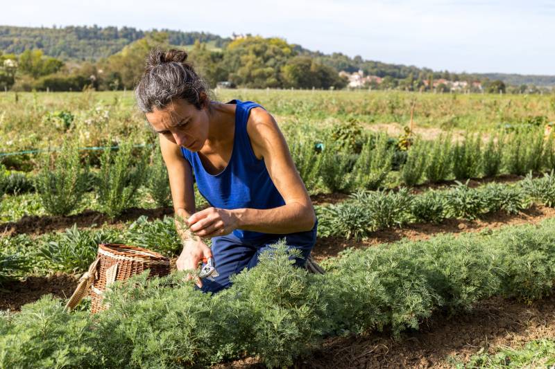 En 2021, elle fait le choix de suivre le chemin de l’agriculture. C’est un chemin qu’elle connaît puisque ses grands-parents, son père et bon nombre de membres de sa famille le pratiquent depuis toujours. Si elle s’y lance c’est parce qu’elle a trouvé une manière qui lui convient d’être agricultrice : mettre en place une micro-ferme, travailler sur une petite surface, transformer et vendre en direct ses produits. Elle part donc se former à l’agriculture biologique dans le Jura. Elle se spécialise dans les plantes aromatiques et médicinales.