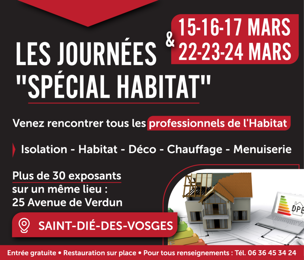 Durant ces deux prochains week-ends, les 15,16, 17 Mars et les 22,23, 24 Mars 2024, auront lieu les Journées Spécial Habitat à Saint-Dié-Des-Vosges.