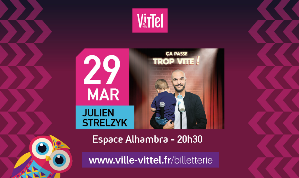 La Ville de Vittel présente Julien STRELZYK – Ça passe trop vite !Il a dépensé tellement d’argent depuis l’arrivée de son premier enfant qu’il a décidé d’en écrire un spectacle, pour avoir un retour sur investissement.