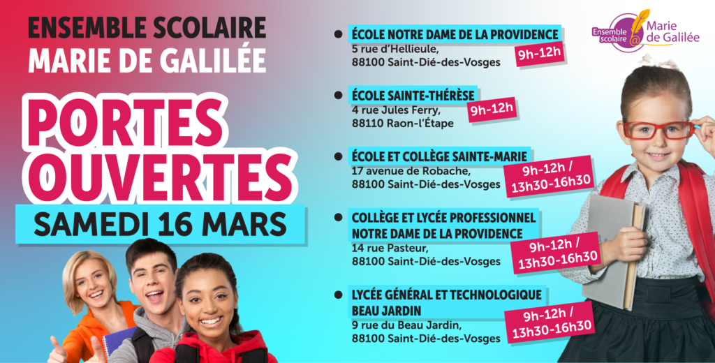 Alors réservez la date du 16 Mars, vous serez accueillis par tous les personnels et les élèves : de 9h à 12h et de 13h30 à 16h30 et uniquement de 9h à midi pour les écoles La Providence et Sainte-Thérèse.