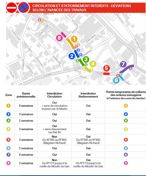 En effet, afin d’assurer la sécurité des utilisateurs de l’espace public, le chantier nécessite de modifier ponctuellement les conditions de circulation et de stationnement : des mesures d’interdiction, de modification de sens de circulation et des déviations seront à prendre en compte pour l’accès aux commerces et habitations. Une signalétique adaptée sera mise en place.