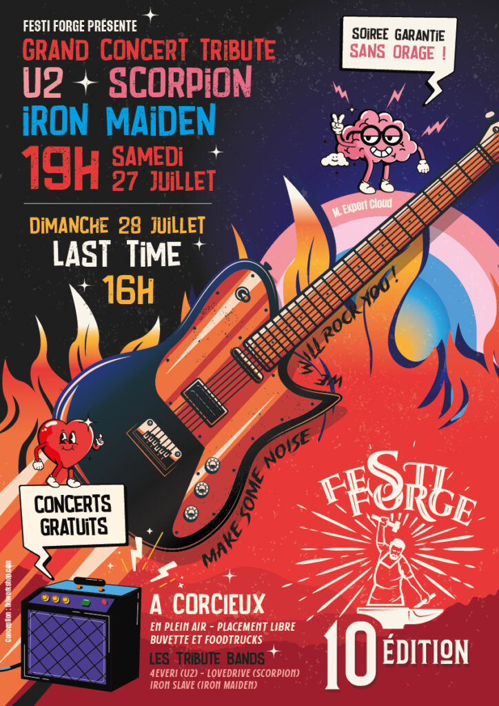 La 10è édition du Festival des forgerons et son marché artisanal aura lieu à Corcieux, les 27 et 28 juillet 2024. Cette édition aura lieu sur le thème « 10, dix ou X ». Au programme : la réalisation d’un bas-fourneau médiéval. Un concert aura lieu samedi 27 juillet à 19h : avec trois groupes hommages : Scorpion, U2 et Iron Maiden.