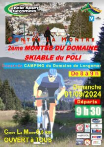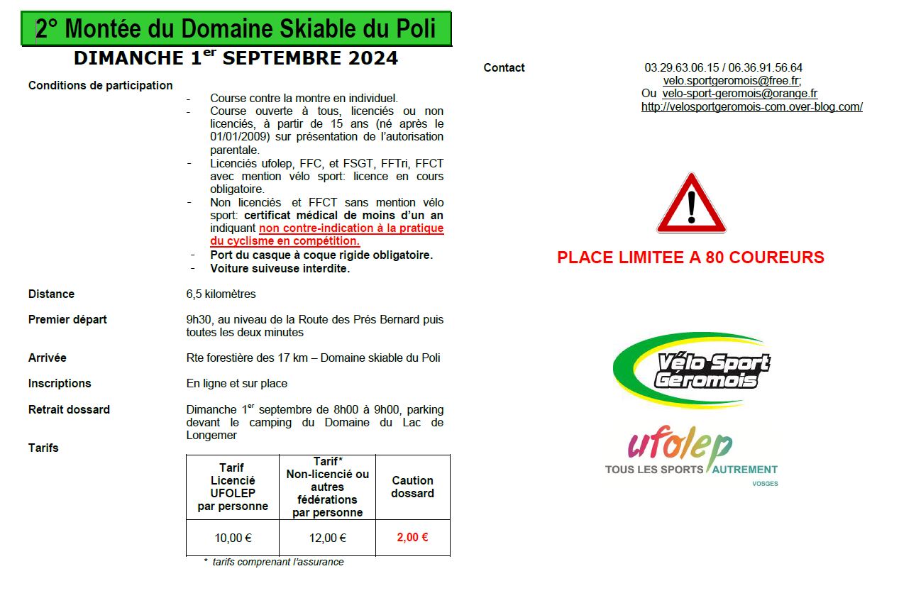 Le Vélo Sport Géromois organisera la 2ème montée du domaine skiable du poli, course contre-la-montre, le dimanche 1er septembre à Xonrupt-Longemer. Cette montée est ouverte à tous , licenciés et non licenciés, à partir de 15 ans.
