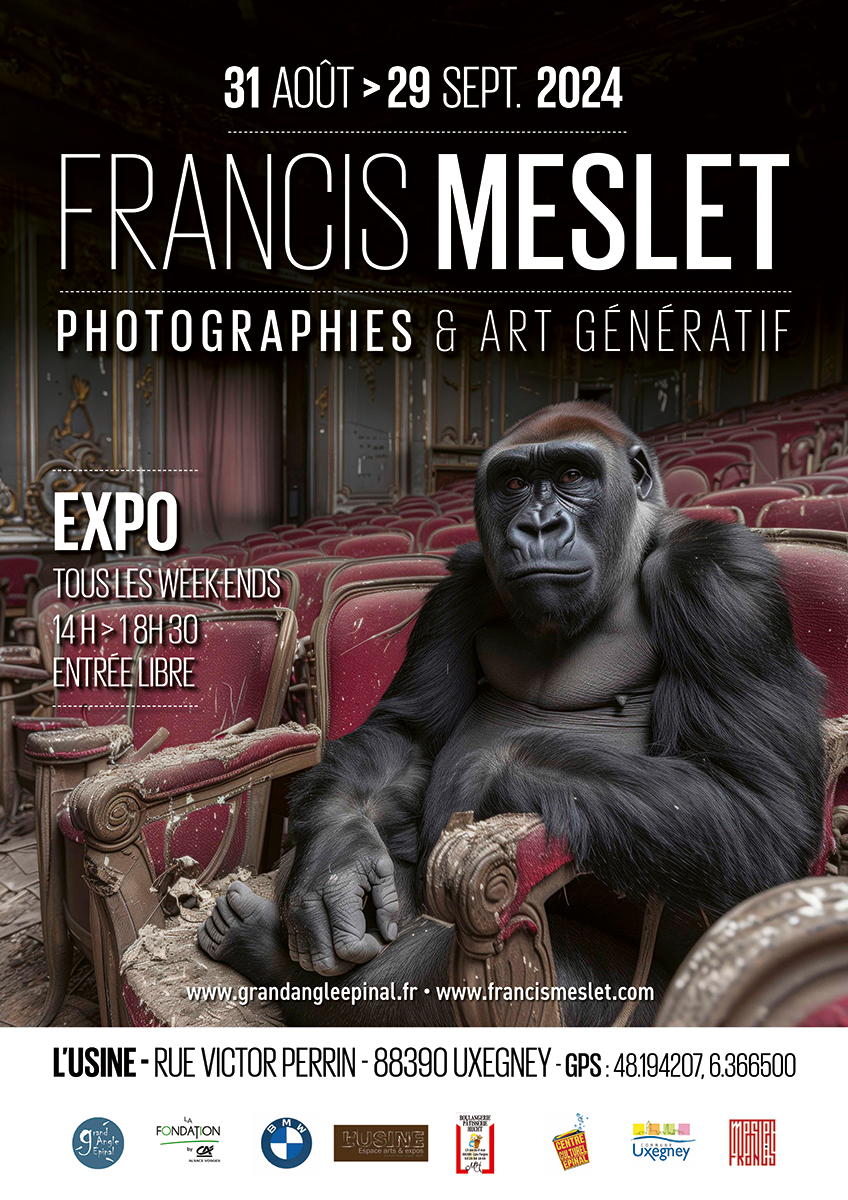 Fort de quinze années d’exploration urbaine en tant que photographe de la poésie des ruines, à l’aide de l’intelligence artificielle, Francis Meslet nous emmène à la découverte d’un monde imaginaire abandonné dans un futur pas si lointain. Bien plus qu’une simple documentation iconographique imaginaire ce travail est une tentative de réconciliation entre le futur et le passé, une méditation sur la fragilité de la mémoire collective. Avec son regard aiguisé, il s’invente poète de la décrépitude, capturant l’âme de la négligence, faisant de chaque image un cri silencieux dans le désert de l’indifférence contemporaine. Auteur photographe, passionné de patrimoine, d’architecture et de paysage urbain, l’artiste parcourt le monde à ses heures perdues, à la recherche de lieux en déshérence, sanctuaires sur lesquels le temps s’est arrêté après que l’homme en ait refermé les portes. Il en ramène des images saisissantes, capsules temporelles témoignant d‘un univers parallèle silencieux, propice à l’évasion de l’esprit et à l’interrogation. Il a photographié à travers l’Europe plusieurs centaines de lieux oubliés. Ces endroits ont fait place au silence au fil du temps. On n’y entend plus guère que le bruissement du vent s’engouffrant par une vitre brisée ou le rythme régulier d’une goutte d’eau qui perle au plafond. « J’en rapporte des images qui témoignent d’une activité passée, d’architectures en déshérence dans les domaines du patrimoine religieux, industriel, santé, spectacle, loisirs… C’est absolument fascinant de pénétrer dans un lieu où des gens ont vécu et ont laissé leurs marques : leurs effets personnels, les meubles, les traces de leurs habitudes… parfois toute une vie se lit entre les toiles d’araignées, quand on pousse la porte de l’un d’entre eux. J’essaie de rester le plus proche possible de la réalité et, représenter au mieux les lieux visités en restant le plus fidèle possible à ce que j’ai ressenti lors de la visite. »