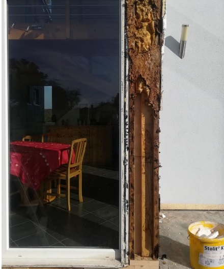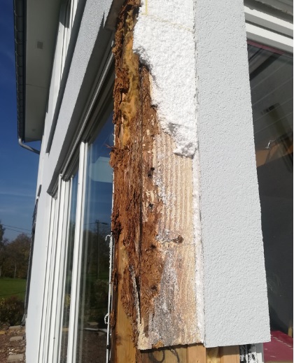 « En 2017, nouvelle découverte toute aussi fortuite d’une infiltration sous le seuil d’une autre baie vitrée lors de travaux de ravalement de façades. Les dégâts sont d’une ampleur bien supérieure à ceux de 2011. Le dirigeant se déplace et avant même d’avoir inspecté le chantier, nous annonce que les travaux seront à notre charge du fait que la garantie décennale est forclose. Un mois de travaux seront nécessaires à éventrer les façades, retirer l’isolation extérieure, retirer l’isolant intérieur gorgé d’eau, remplacer la structure bois pourrie et refermer les façades. » déplore le couple vosgien.