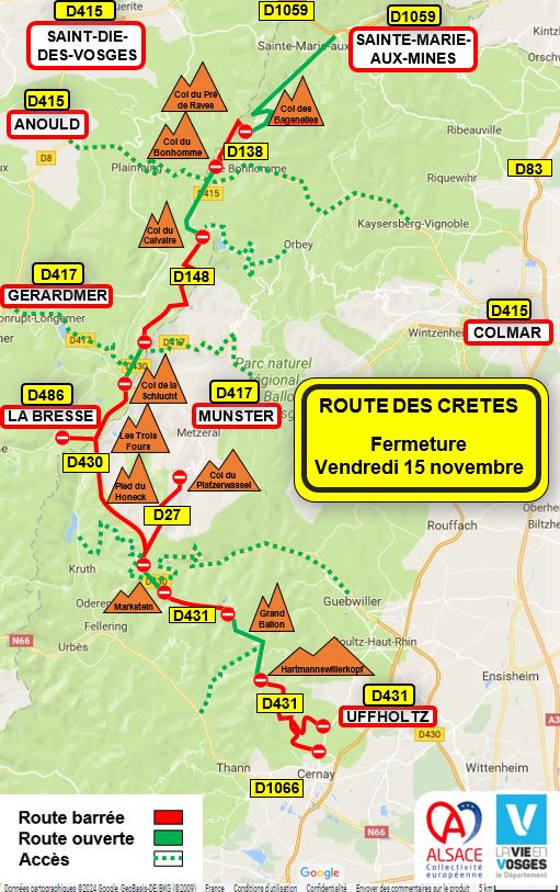 La Collectivité européenne d’Alsace et le Département des Vosges procéderont conjointement à la fermeture de la route des Cretes et de ses accès vendredi 15 novembre à 16 h, depuis Uffholtz (RD431) jusqu’au col des Bagenelles (RD148).