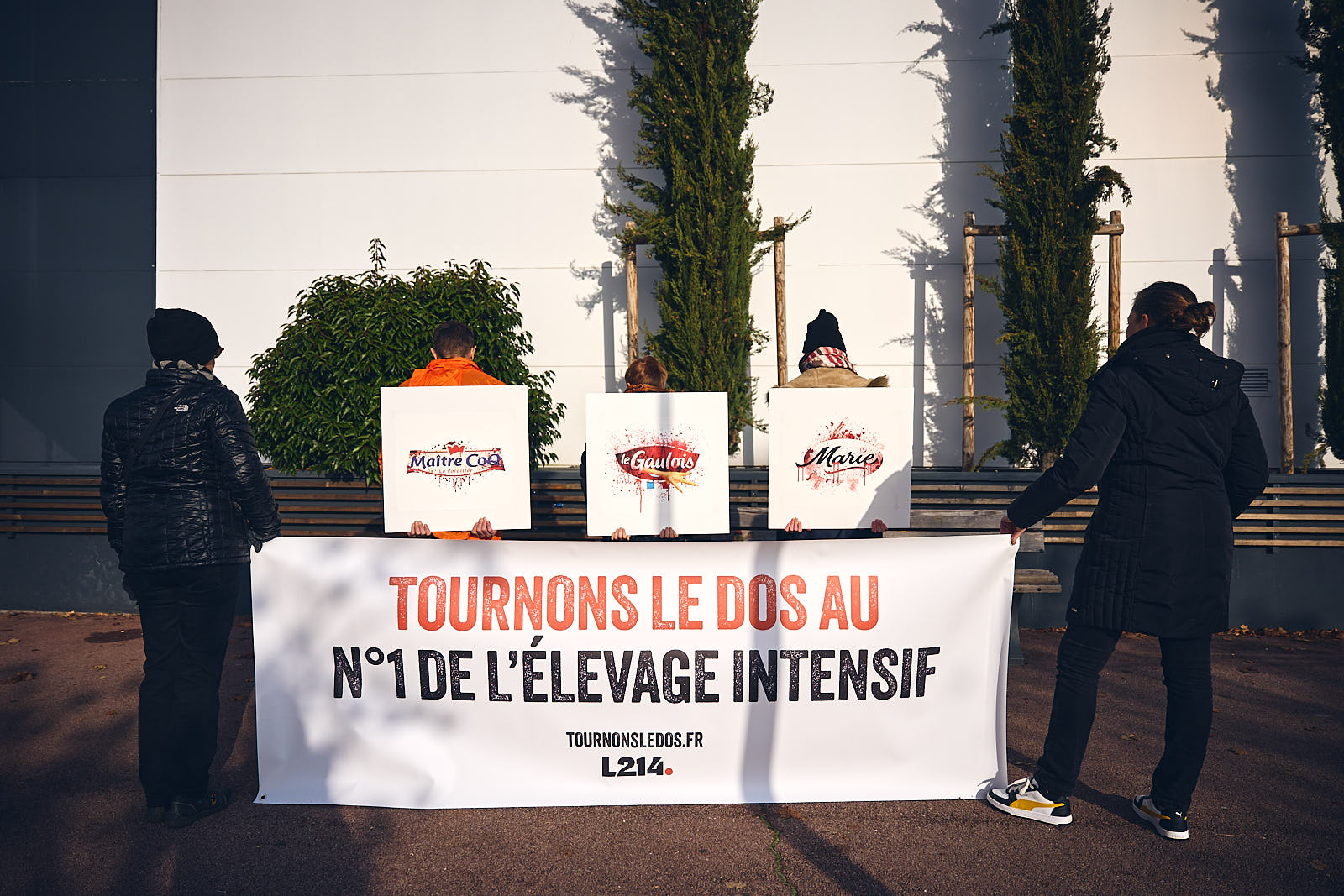 6 bénévoles de l’association de défense des animaux ont présenté une banderole devant l’entrée de l’hypermarché déodatien, sur laquelle on pouvait y lire « Tournons le dos au n°1 de l’élevage intensif ». Ils présentaient également des panneaux avec les marques principales de LDC que sont Marie, Maître Coq et le Gaulois… mais en versions ensanglantées pour interpeller les passants.