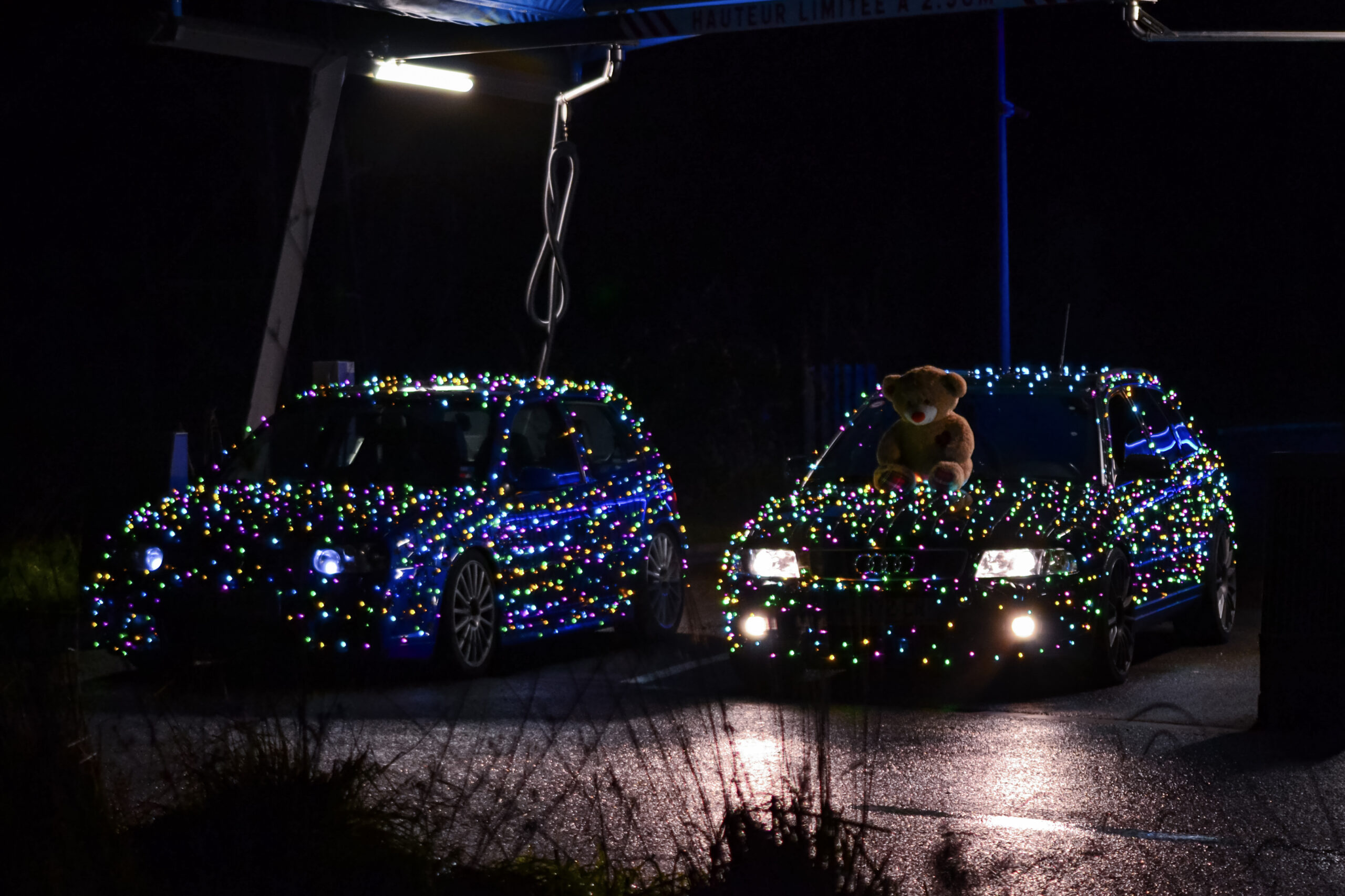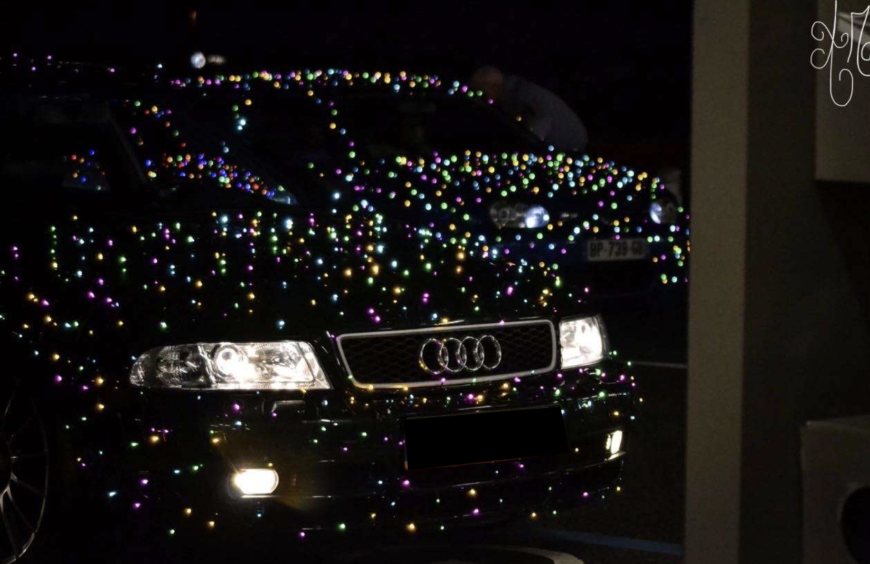 Inspirée d’une tendance venue des États-Unis, leur installation nécessite un certain savoir-faire. Ils utilisent un transformateur branché à l’allume-cigare pour alimenter les guirlandes lumineuses. Ces dernières sont minutieusement scotchées sur les véhicules tout en veillant à laisser l’accès libre aux portes, au capot et au coffre. Toujours prêts, ils gardent du ruban adhésif à portée de main pour ajuster les décorations si nécessaire.