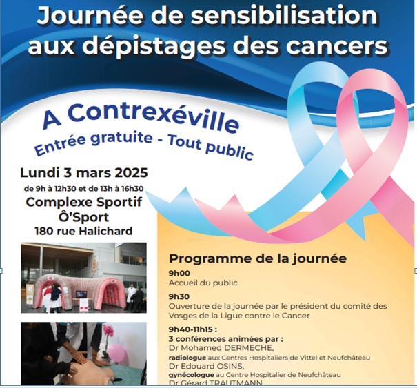 Une journée de sensibilisation aux dépistages des cancers, notamment des 3 dépistages organisés (sein/colon/utérus) se déroulera le 3 mars à Contrexéville de 9h30 à 12h30 et de 13h00 à 16h30.