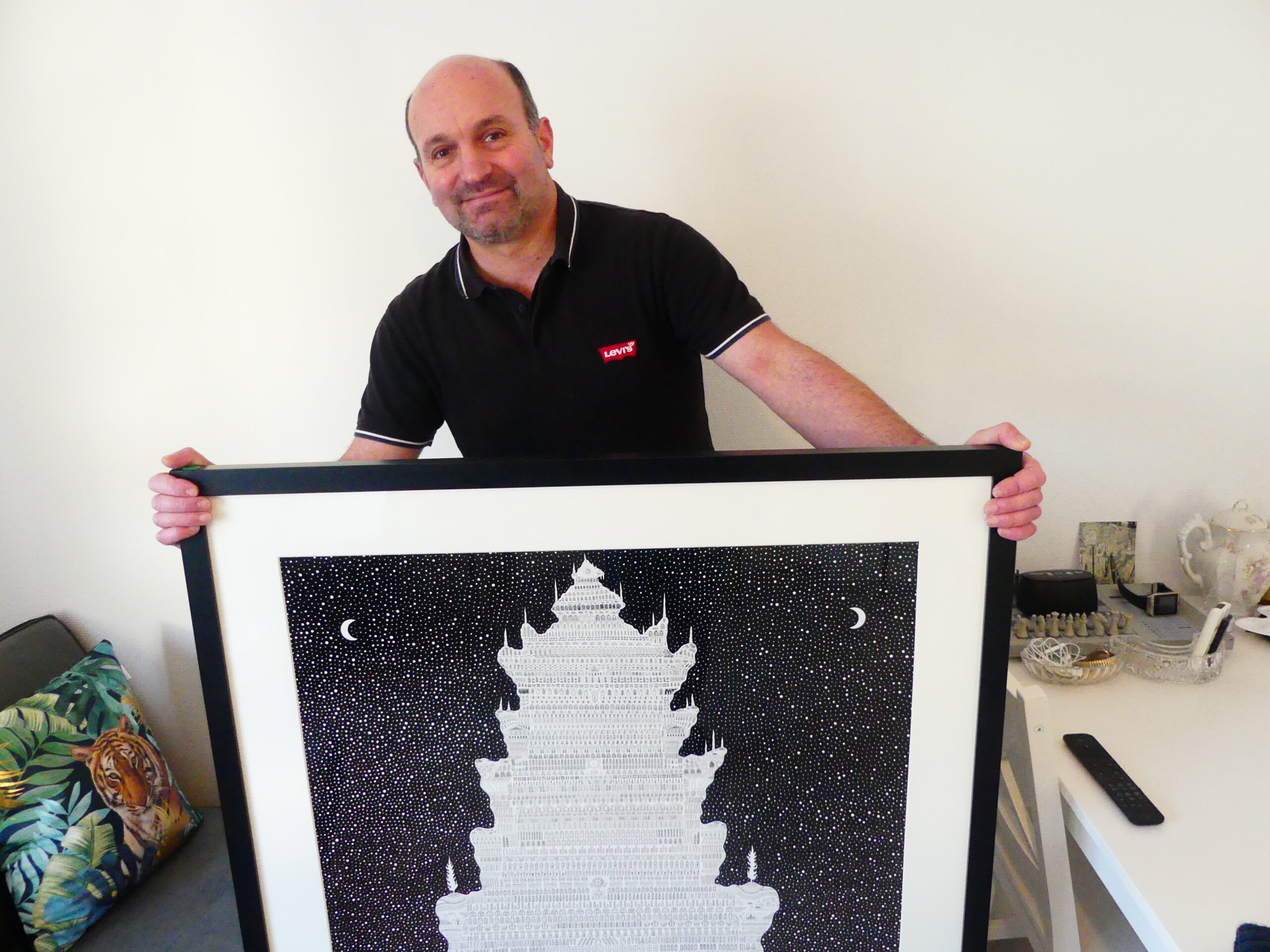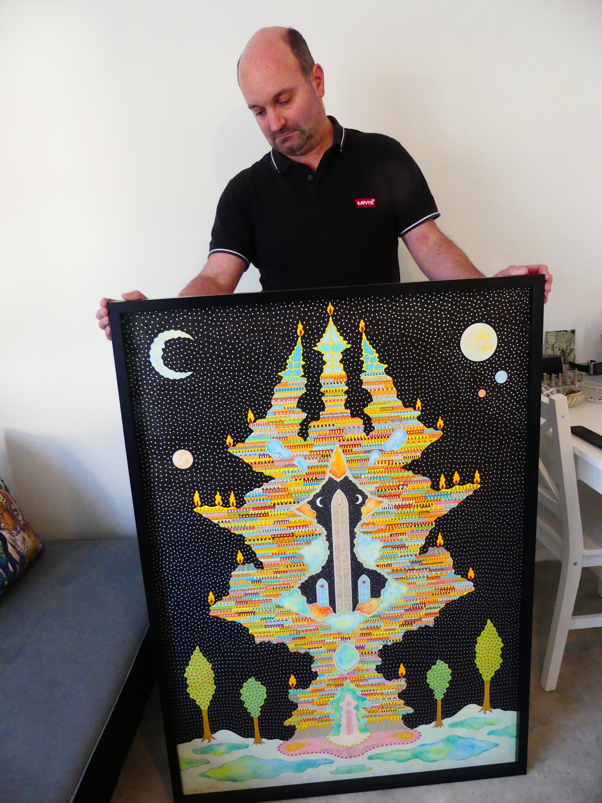Cette œuvre, « Sorti de nulle part », a déjà été primée en 2022 au conseil départemental des Vosges. Son travail s’associe à de l’art brut et un peu au surréalisme. On retrouve également souvent de la symétrie et il aime travailler sur des grands formats.