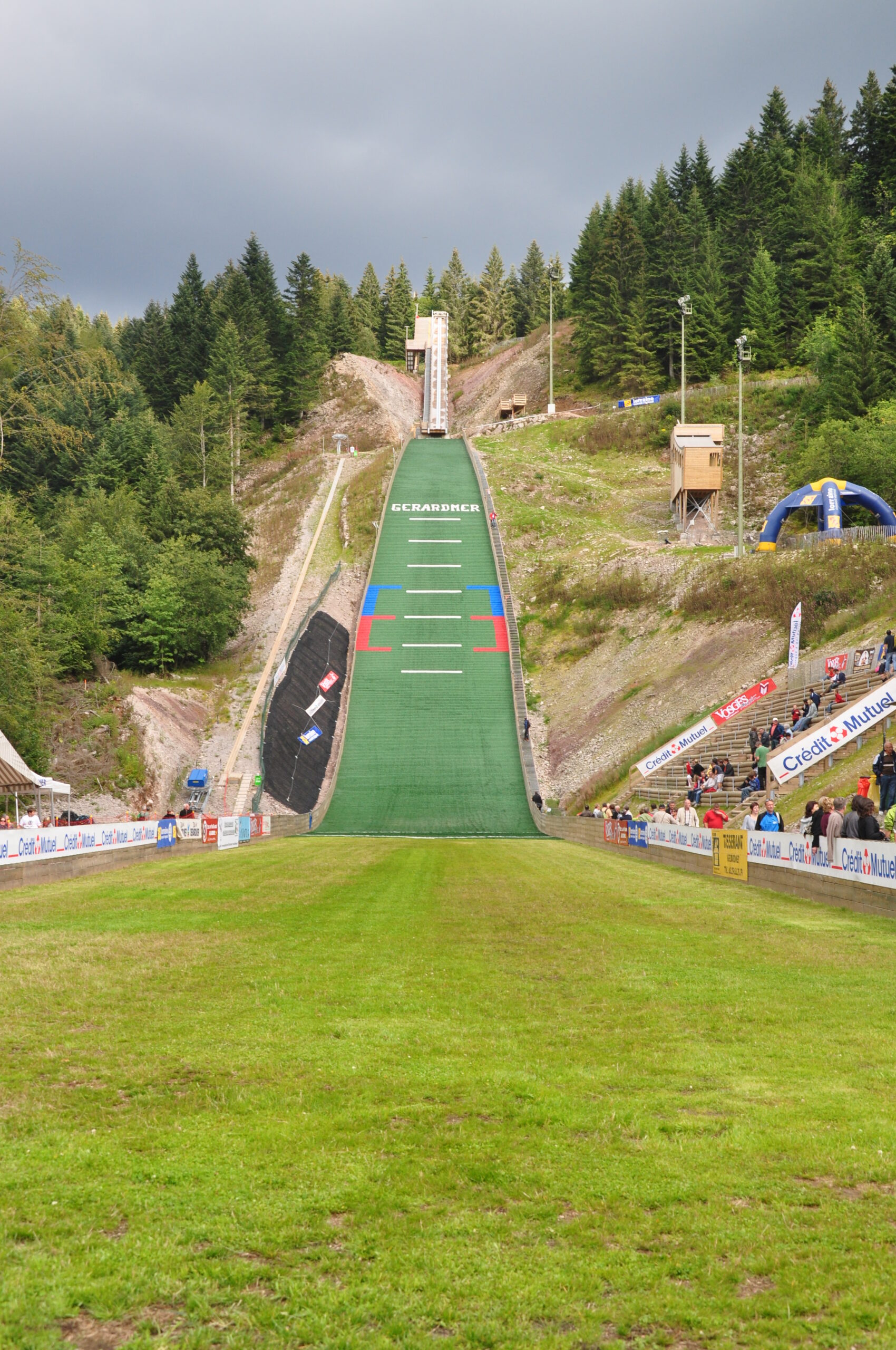L’enneigement sur site étant actuellement inexistant, le tremplin est donc resté en version estivale, piste d’élan et de réception sont en matériaux synthétiques ce qui permet une pratique régulière de l’activité tout au long de l’année.