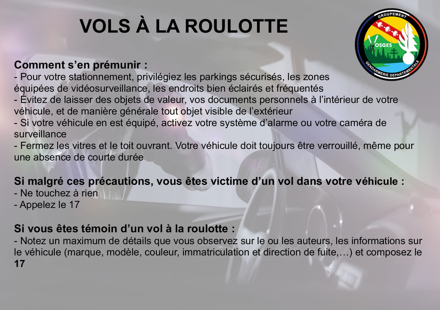 La Gendarmerie des Vosges alerte sur la recrudescence des vols à la roulotte dans le département. Elle invite à privilégier les parkings sécurisés, vidéosurveillés, éclairés et à éviter de laisser des objets de valeur dans les véhicules. Il est vivement conseillé de fermer les vitres, les toits ouvrants et le véhicule, même pour une courte durée. Si vous êtes victime d’un vol, contactez le 17.