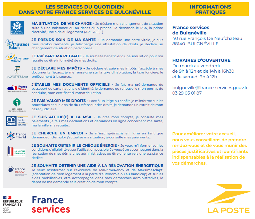 Dans un même lieu, au sein du bureau de poste de Bulgnéville, situé 40 rue François de Neufchâteau, les habitants ont accès aux services de La Poste mais aussi aux services de 10 opérateurs partenaires, ceci afin de faciliter leurs démarches administratives du quotidien.
