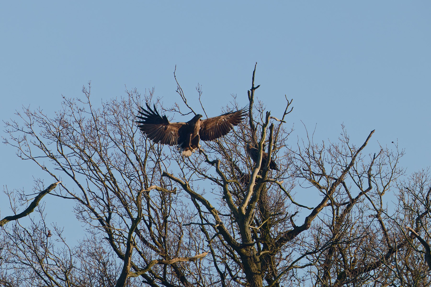 Le vendredi 27 décembre, vers 14h, alors qu’un habitué du parc observait Toundra et Bolchoï, le couple de pygargues à queue blanche résidant au parc, deux silhouettes imposantes ont attiré son attention dans le ciel. Deux pygargues à queue blanche tournaient en cercle au-dessus de l’étang des cormorans, provoquant la fuite immédiate des canards et autres oiseaux présents. Après plusieurs minutes de vol, ils se sont posés sur des arbres en face de l’étang. La distance de fuite des pygargues sauvages, d’environ 300/400 mètres, n’a pas empêché de capturer ce moment exceptionnel. Cette observation prend une dimension encore plus marquante lorsqu’on sait qu’il n’existe actuellement que 7 à 8 couples nicheurs sur l’ensemble du territoire français. La présence de ce couple, a priori en formation, est un symbole d’espoir pour le retour de l’espèce dans la région.