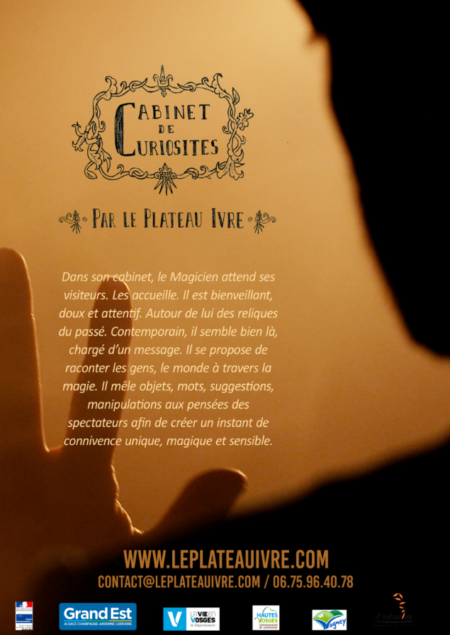 Dans son cabinet, le Magicien attend ses visiteurs. Les accueille. Il est bienveillant, doux et attentif. Autour de lui des reliques du passé. Contemporain, il semble bien là, chargé d’un message. Il se propose de raconter les gens, le monde à travers la magie. Il mêle objets, mots, suggestions, manipulations aux pensées des spectateurs afin de créer un instant de