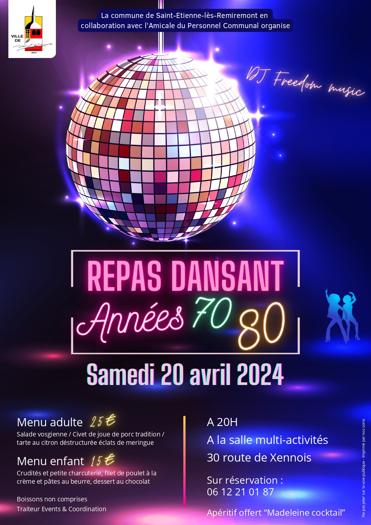 La commune de Saint-Etienne-lès-Remiremont en collaboration avec l’Amicale du Personnel Communal organise un repas dansant le samedi 20 avril à 20 h 00.