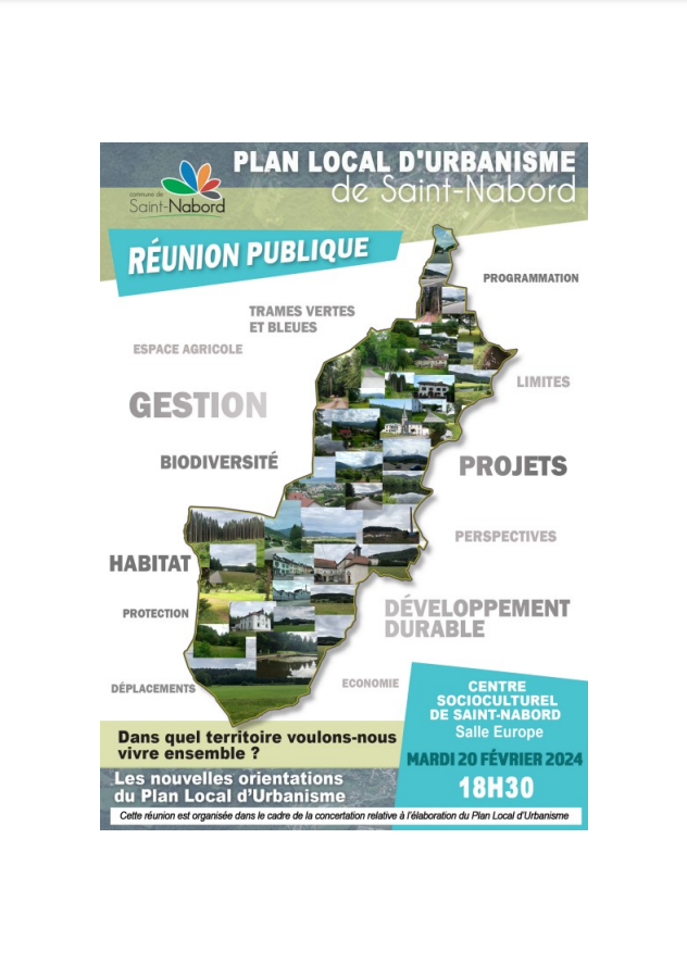 Dans le cadre de la concertation relative à l’élaboration du plan local d’urbanisme de Saint-Nabord, la municipalité organise une deuxième réunion publique, mardi 20 février à 18h30 au Centre Socioculturel de Saint-Nabord, salle Europe.
