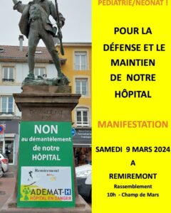 L’ADEMAT-H, association pour la défense, le maintien, l’amélioration de la maternité et l’hôpital de Remiremont, soutenue par le conseil de surveillance de l’hôpital, les élus de la commune et le président du Conseil départemental, appelle à la mobilisation samedi prochain. Rendez-vous est donné samedi 9 mars à 10h00 au Champ de Mars à Remiremont pour une manifestation dans les rues de Remiremont.