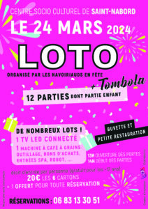 L’association « Les Navoiriauds en Fête », présidée par Fabienne Wary, annonce son super loto pour le dimanche 24 mars au centre socioculturel. Début des parties à 14 h 00 et ouverture des portes dès 13 h 00.