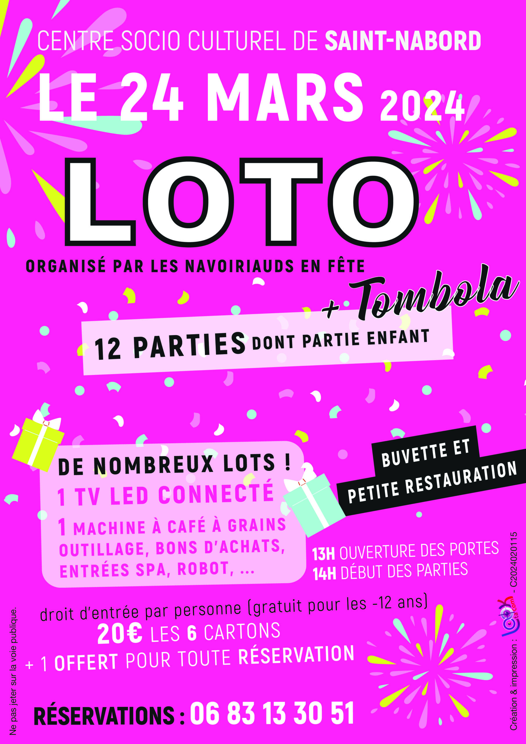 Douze parties figurent au programme de ce loto, dont la partie enfants. Les 6 cartons seront proposés au tarif de 20 € (gratuité pour les enfants de moins de 12 ans) et le carton supplémentaire à 4 €. Il est bon de savoir qu’un carton sera offert pour toute réservation faite avant le samedi 23 mars à midi en composant le 06.83.13.30.51.