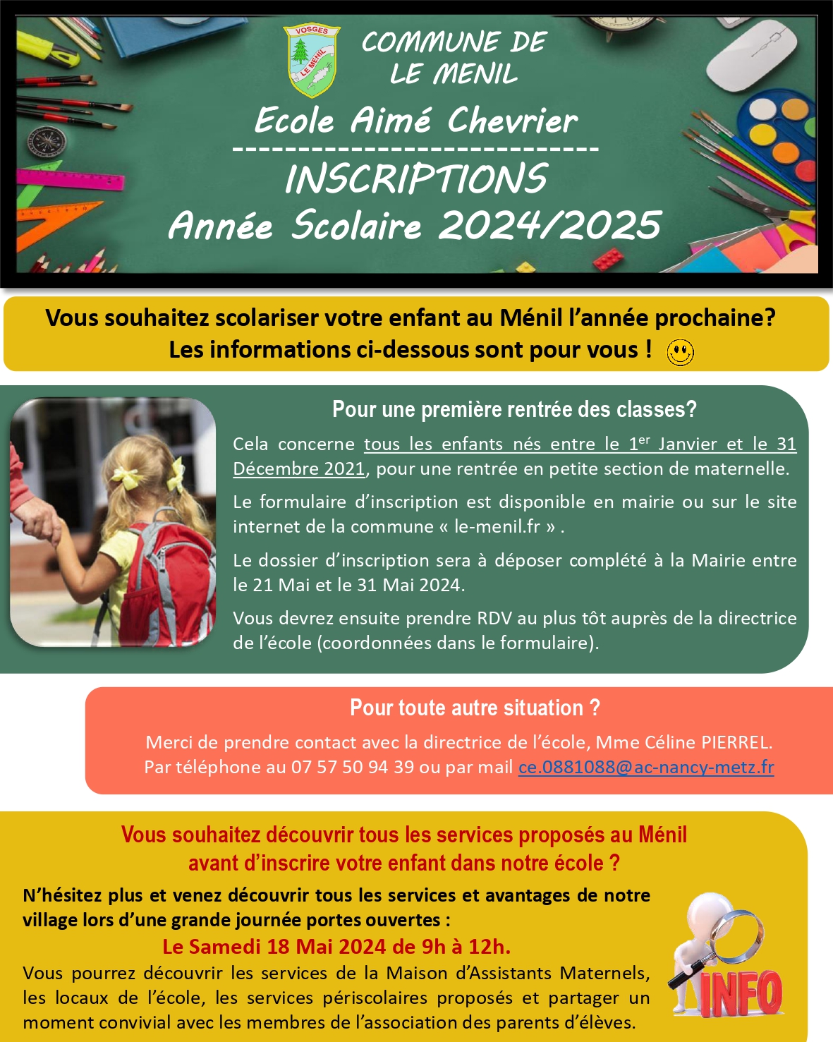 Retrouvez les modalités d’inscriptions à l’école du Ménil et l’annonce d’une grande journée Portes Ouvertes le 18 Mai 2024 qui permettra aux parents de jeunes enfants de découvrir l’ensemble des services mis en place au sein de la commune :