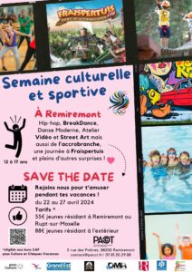 Clôture de la Semaine : Le séjour se terminera par une soirée de clôture le 27 avril à 20h au centre socioculturel de Rupt-sur-Moselle, où sera présenté un spectacle de danse, une exposition de street art et un reportage vidéo réalisé par les participants.