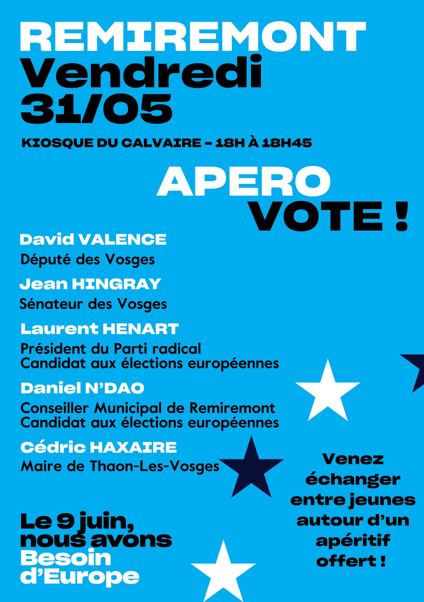 Dans le cadre de la campagne pour les élections européennes, Daniel N’Dao, Responsable MODEM dans les Vosges, ainsi que candidat aux élections européennes sur la liste Besoin d’Europe, propose deux rendez-vous faisant écho au déplacement de Monsieur Laurent HENART, président du Parti Radical, candidat aux élections européennes en 16e position sur la liste Besoin d’Europe.