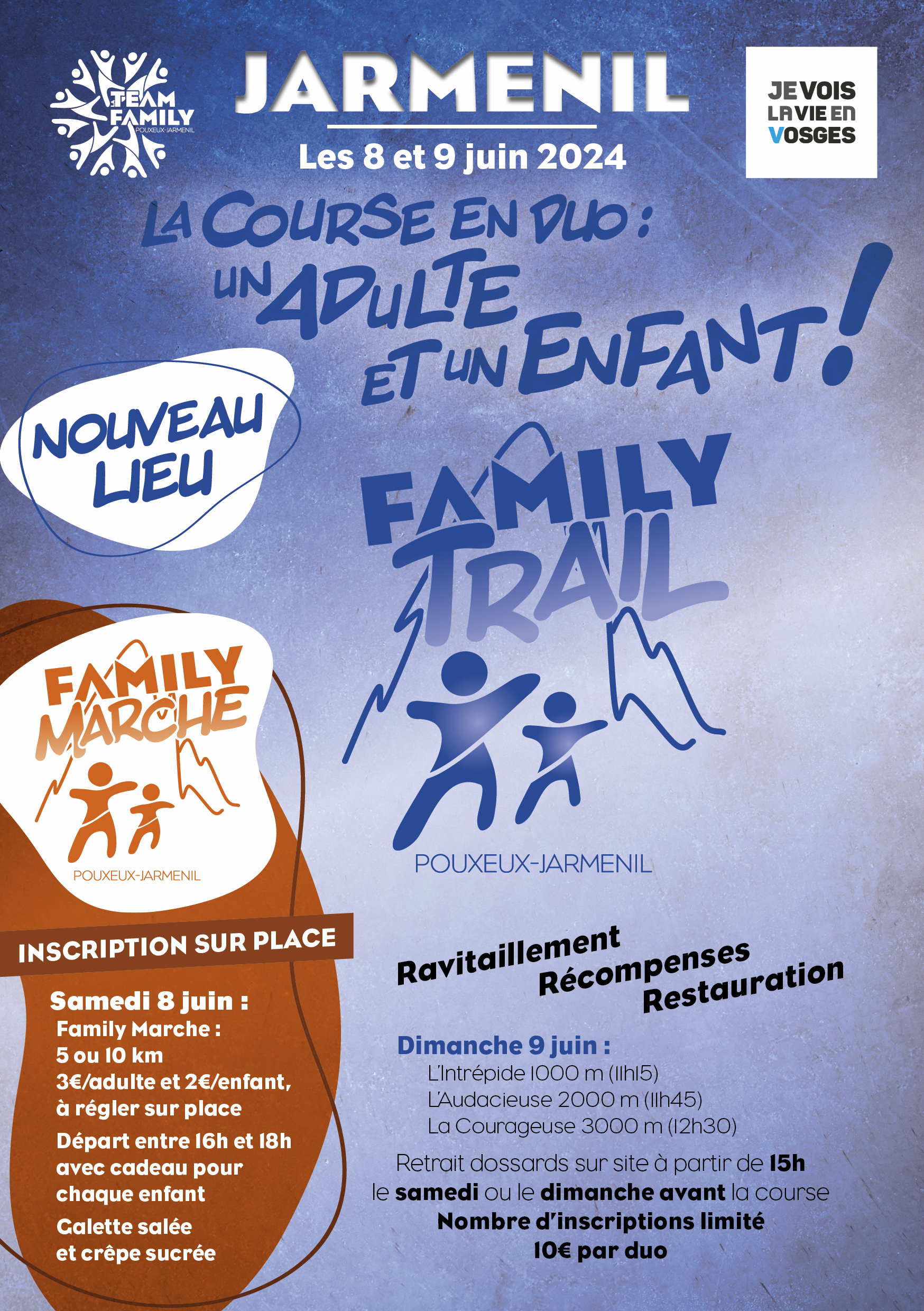 NOUVEAU !!! Pour sa 6ème édition du Family Trail le weekend du 8 et 9 juin organisé par la TEAM FAMILY aura lieu a Jarménil !