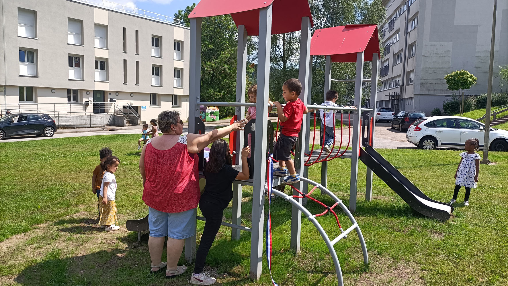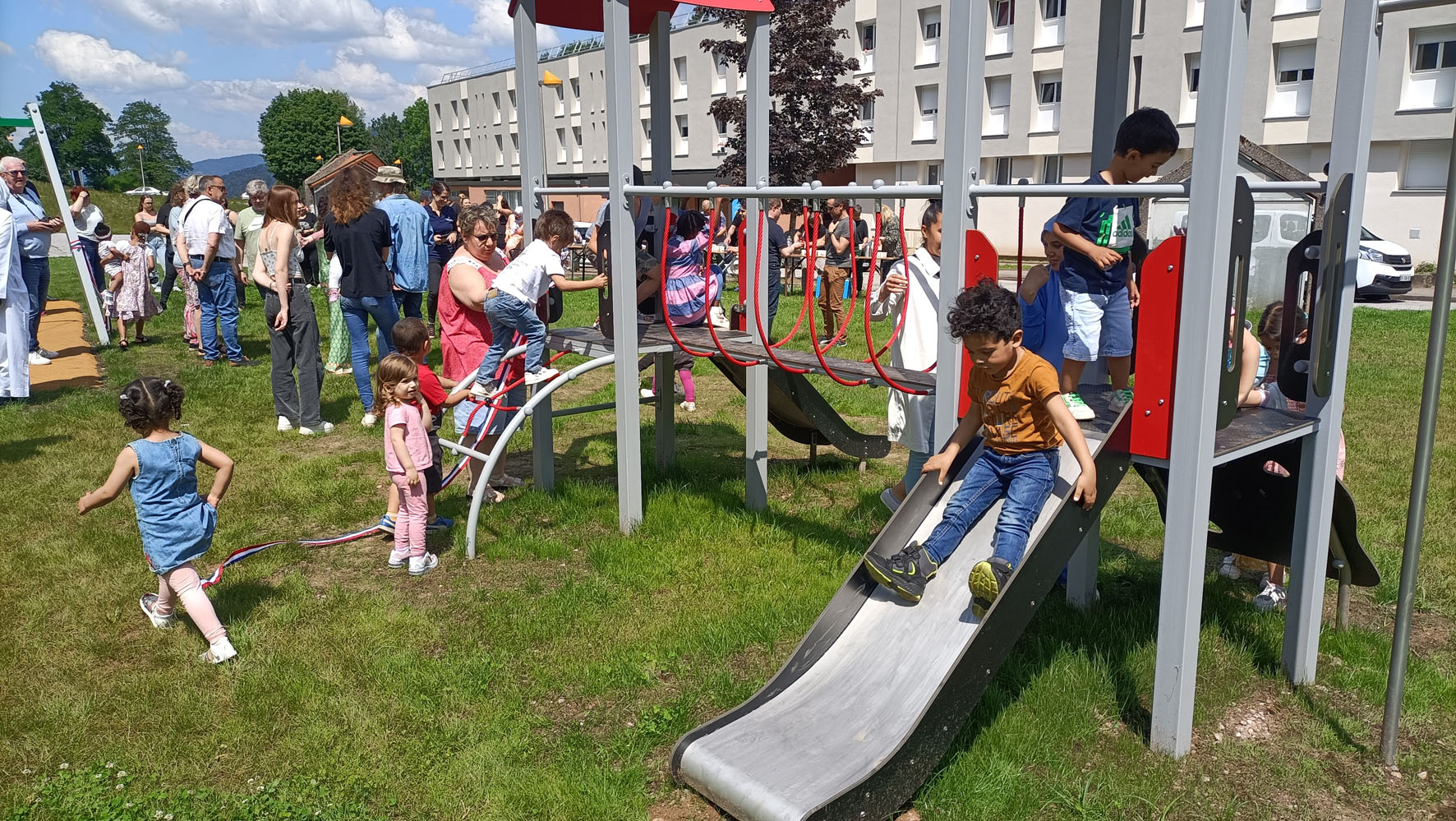 Ces structures ludiques ont été installées sur le terrain laissé libre par la déconstruction de la Tour Neuvillers. L’aménagement paysager, avec l’ajout d’arbres et d’une aire de pique-nique, sera réalisé à l’automne en partenariat avec Vosgelis.