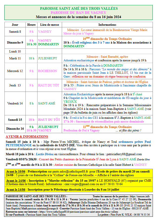 6 juin 2024 | A la Une | Agenda | La Bresse & son canton | Le Thillot & son canton | Religion | Vie religieuse