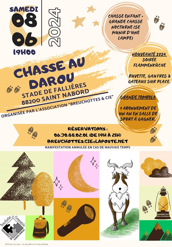 La chasse au darou se déroulera en deux temps : tout d’abord celle réservée aux enfants, puis la chasse en nocturne pour les adultes (prévoir une lampe). Renseignements et réservations au 06.30.88.02.01 entre 19 h 00 et 21 h 00 ou par mail : breuchottes.cie@laposte.net