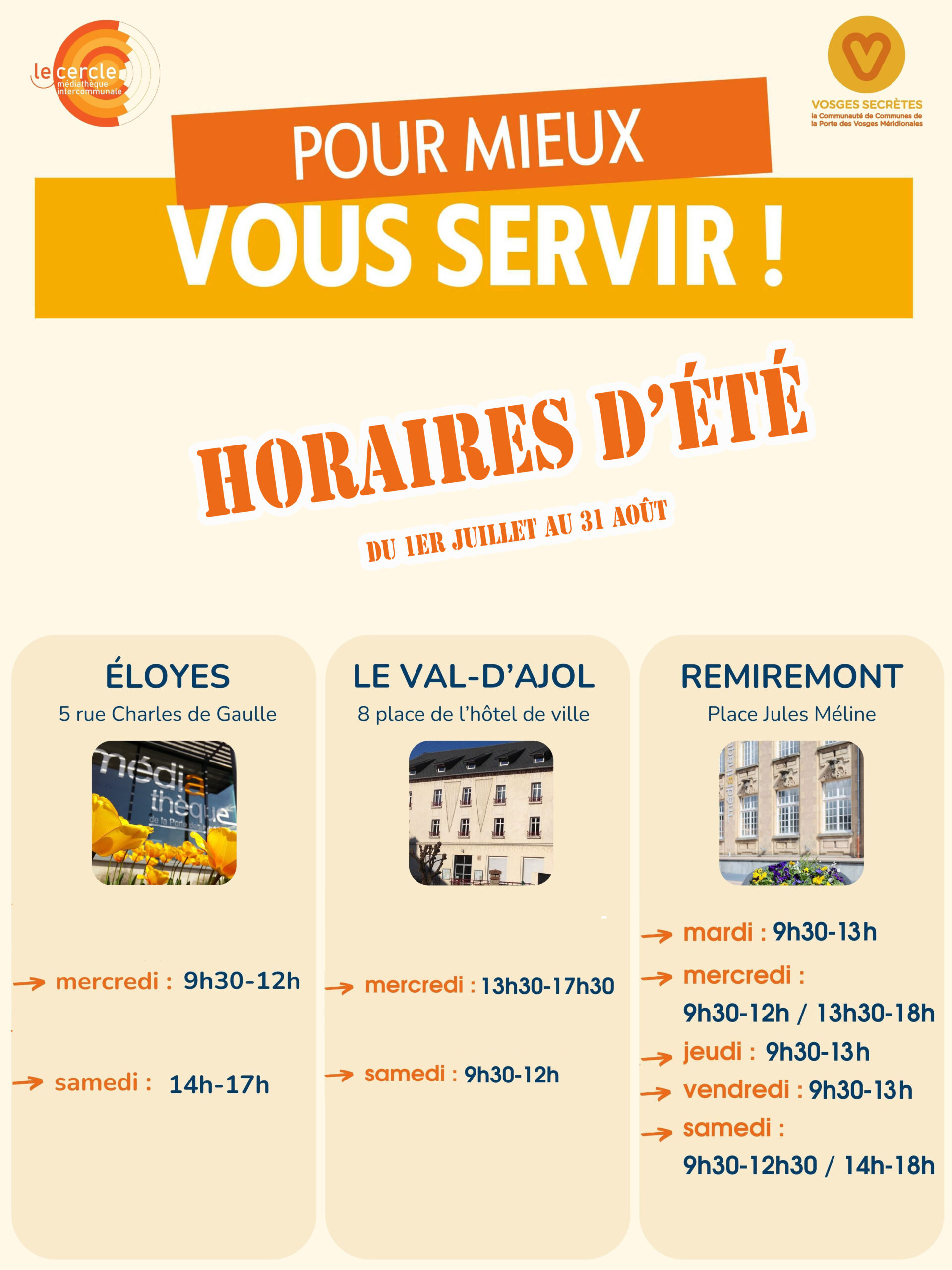 Deprecated: Use of "parent" in callables is deprecated in /project/VIDEV/web/app/plugins/simple-lightbox/includes/class.options.php on line 501 Médiathèque Le Cercle : les horaires d'été - Remiremont Info
