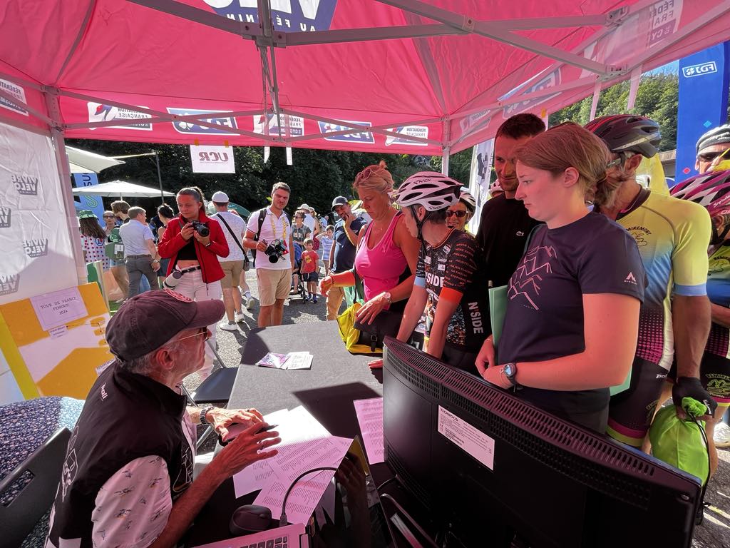 Ce fut un grand bonheur pour nous d’accueillir ainsi 125 participants au stand de la FFC mis à notre disposition pour pointer les inscriptions et remettre à chaque inscrit un maillot blanc FDJ.