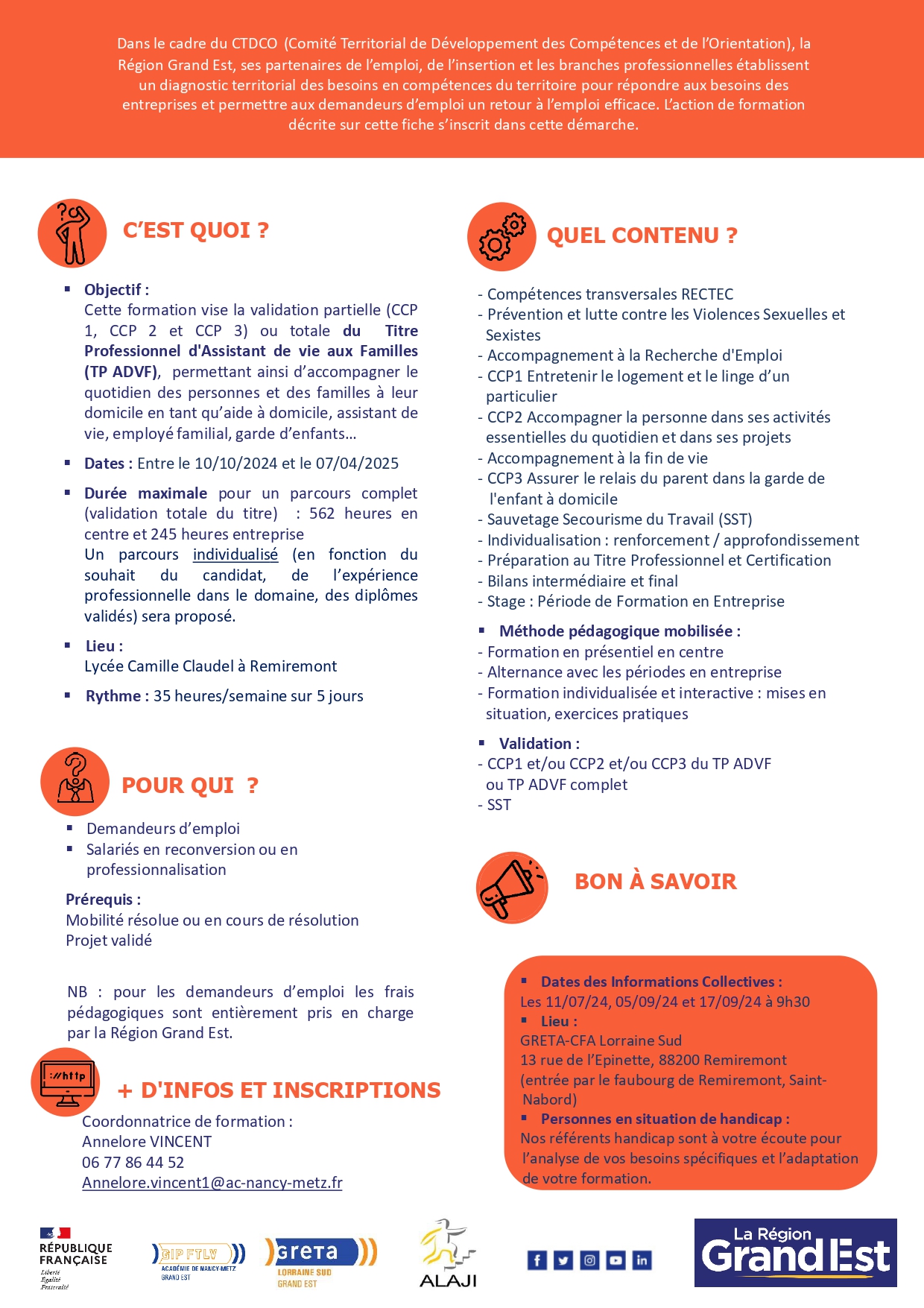Le GRETA-CFA Lorraine Sud met en place le Titre professionnel Assistant de Vie aux Familles (ADVF), une formation financée par la Région Grand-Est et menée en partenariat avec l’ALAJI, à Remiremont. Cette formation permettra aux stagiaires de s’engager dans une carrière enrichissante et dans un secteur d’activité qui recrute. En effet, les personnes titulaires de cette certification professionnelle peuvent accéder aux métiers d’aide à domicile, assistant de vie, employé familial, garde d’enfants…