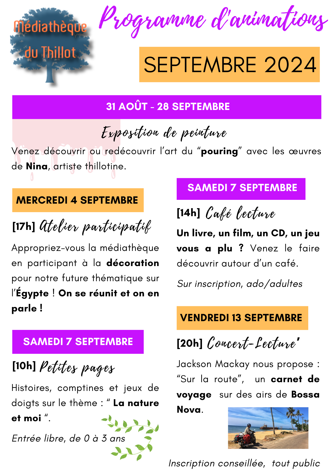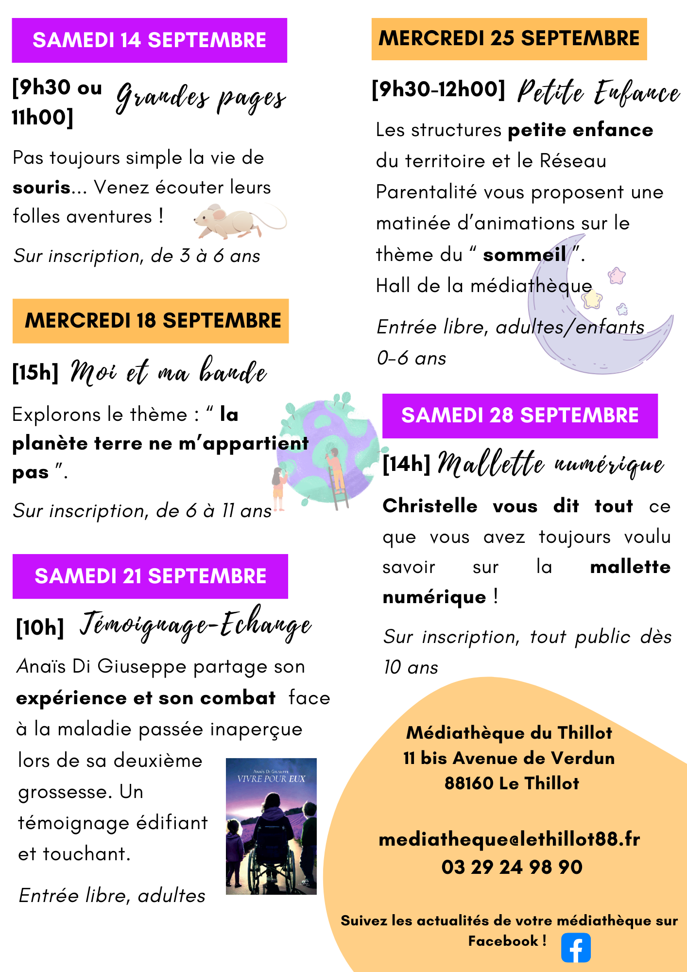 Nous faisons appel à votre attention : Samedi 28 septembre, la médiathèque ouvrira ses portes à 11h (au lieu de 09h30), merci pour votre compréhension. Mais aussi… Pour ceux qui sont passés à côté de l’information, cet été, nous avons reçu la boîte de retour ! Vous la trouverez à l’entrée de la médiathèque. Vous trouvez portes closes ? Vous manquez de temps ? N’hésitez pas à déposer les documents empruntés (livres, cd, dvd, jeux…) dans la boîte de retour. Une très belle rentrée à tous avec un programme qui, on l’espère, saura vous satisfaire ! |