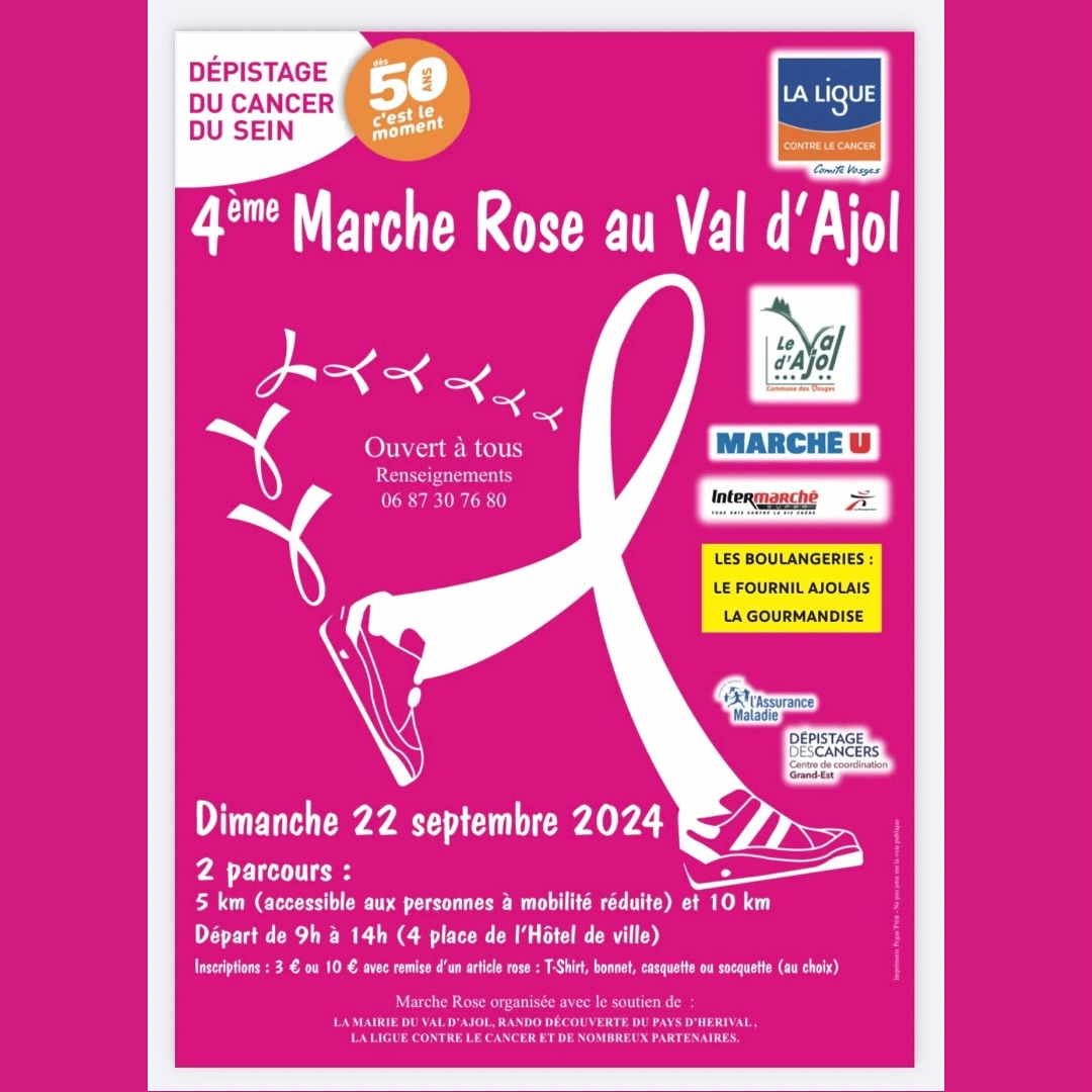 Une 4e édition de la Marche Rose est organisée au Val d’Ajol dimanche 22 septembre avec le soutien de la commune, de l’association Rando Découverte du pays d’Hérival et de la Ligue contre le cancer. 2 parcours sont proposés de 5 ou 10 km. Tarif : 3 ou 10 € avec remise d’un article rose au choix. De 9 h à 14 h au 4 Place de l’Hôtel de Ville.