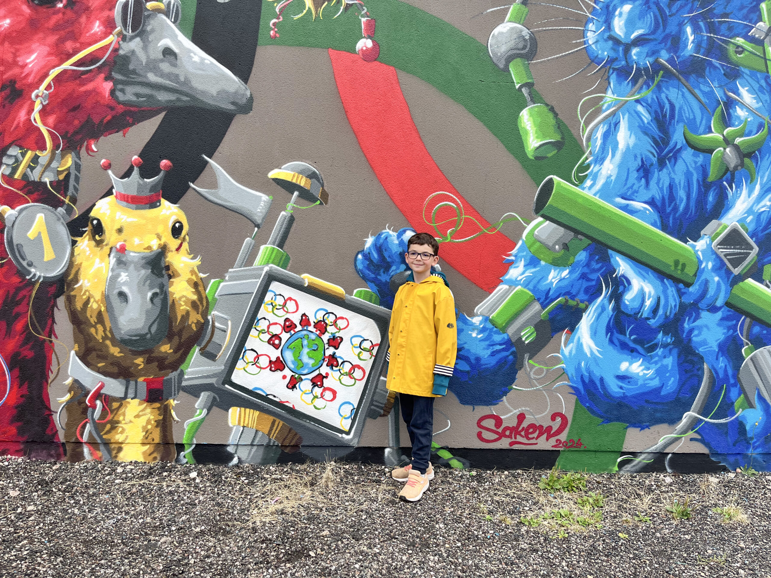 Pour l’occasion, Paul, scolarisé à l’école du Fossard de Saint-Étienne-lès-Remiremont, était présent avec son enseignante et sa maman pour venir regarder le dessin collectif réalisé avec sa classe et lauréat dans la catégorie « œuvre collective ». Il a très vite retrouvé son travail au milieu des animaux géants peints par Sakew.