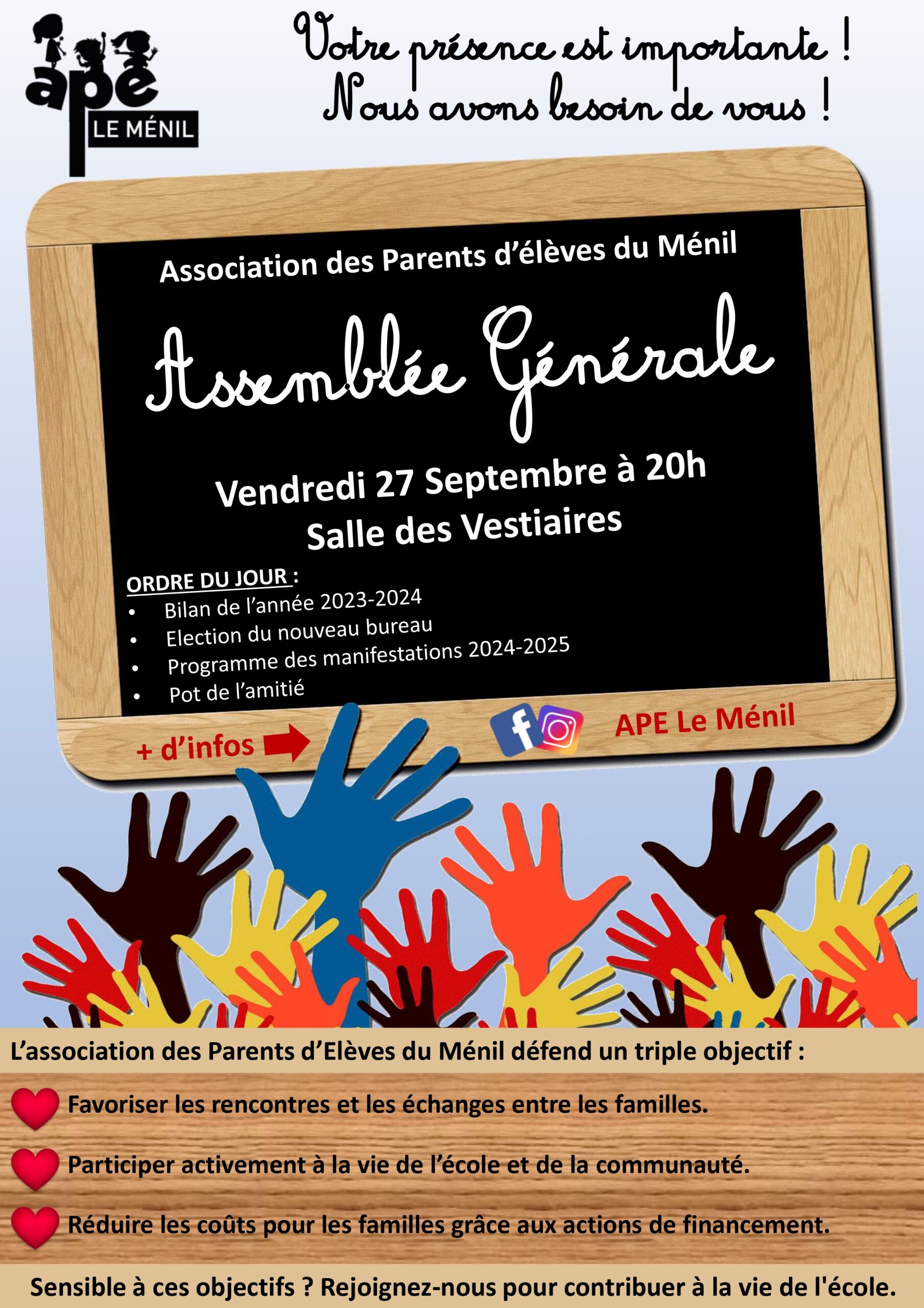 Votre présence est essentielle pour faire vivre et animer notre école. Peu importe le temps que vous pouvez y consacrer, vous êtes tous concernés par nos objectifs :