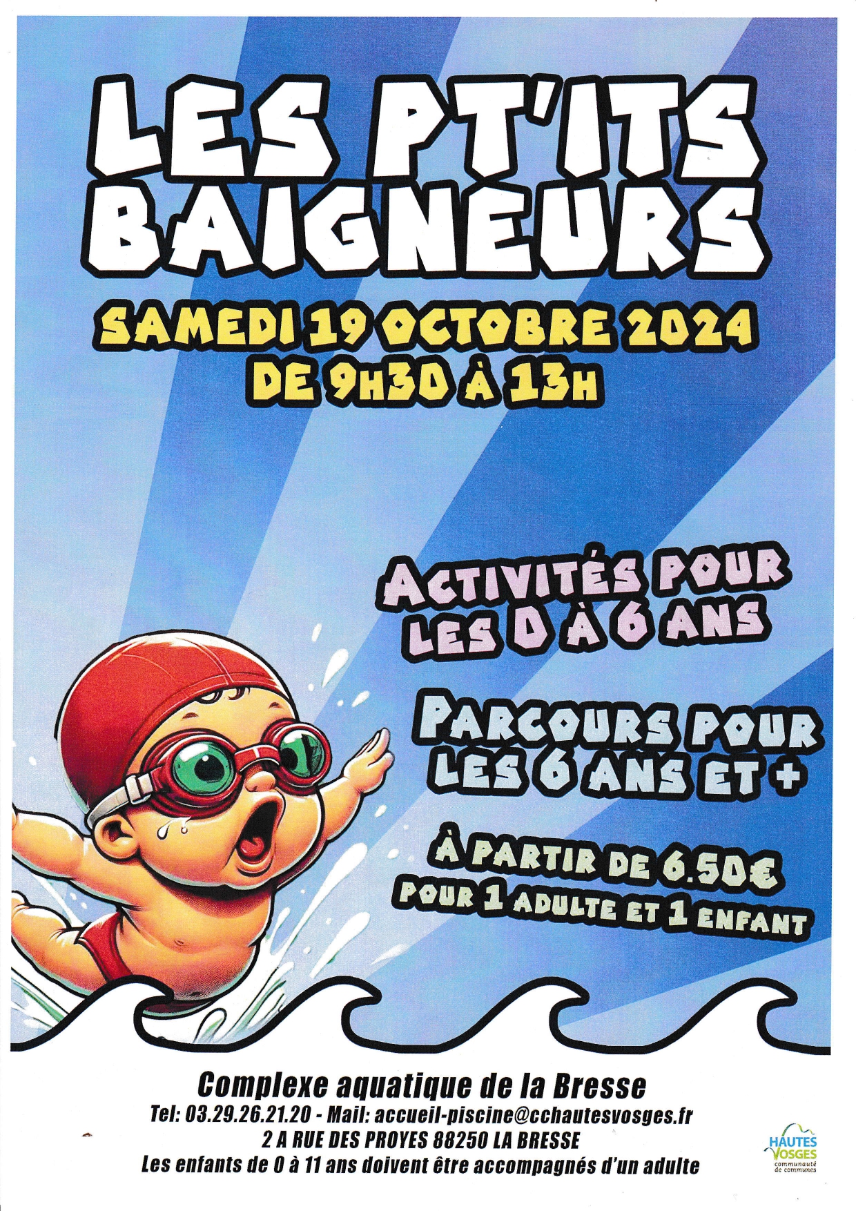 Le samedi 19 octobre de 9 h 30 à 13 h, la piscine de La Bresse propose une activité petits baigneurs de 0 à 6 ans et plus. Tarif fixé à 6€50 pour une adulte et un enfant. Retrouvez l’affiche ci-dessous :
