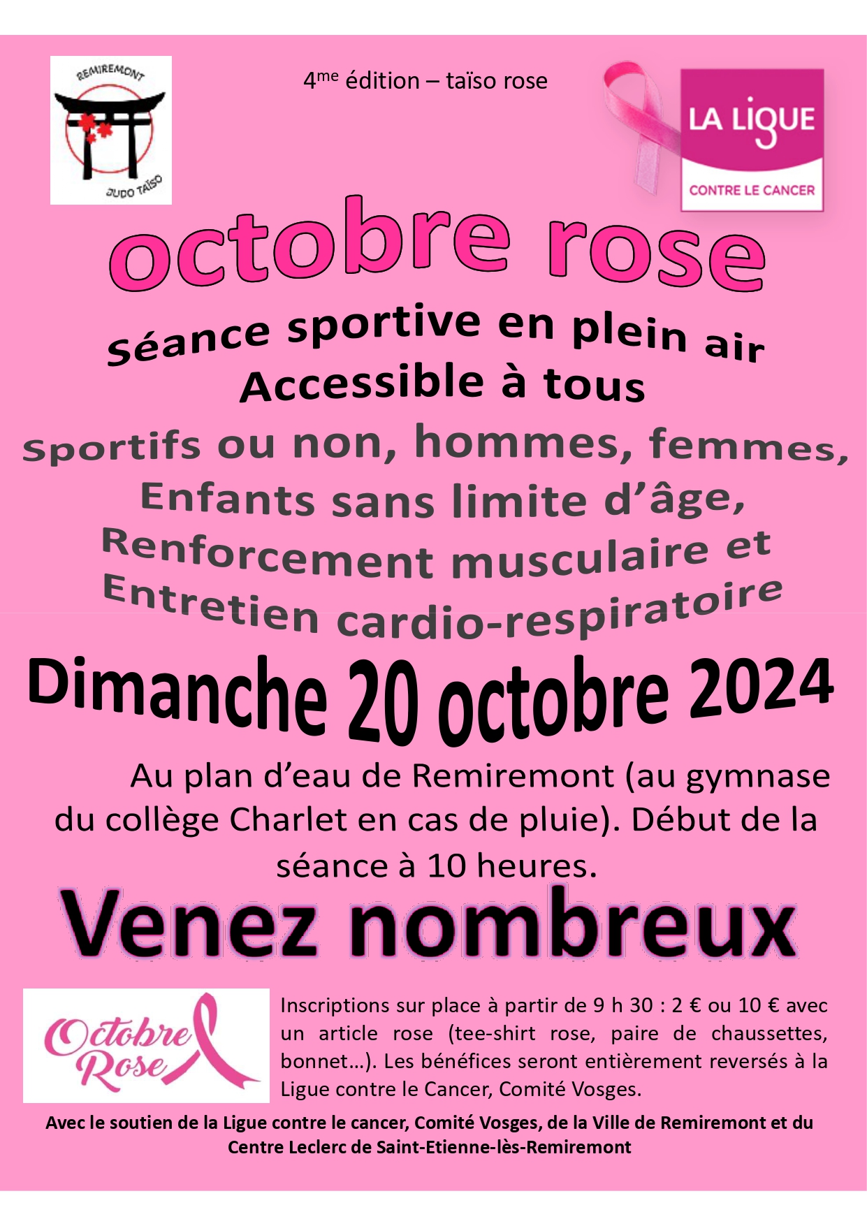 Dans le cadre d’Octobre Rose, Remiremont Judo proposera une séance sportive en plein air au plan d’eau de Remiremont (en cas de pluie, au gymnase du collège Charlet) à 10 h le dimanche 20 octobre. L’évènement est ouvert à tous, sportifs ou non, hommes, femmes et enfants. Au programme : renforcement musculaire et entretien cardio-respiratoire !