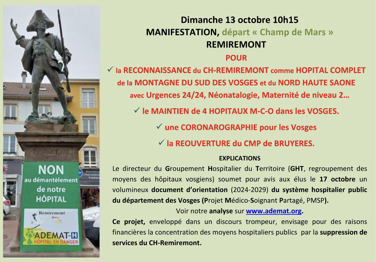 Une manifestation est organisée ce dimanche 13 octobre par l’Ademat-H pour le maintien complet des services du centre hospitalier de Remiremont. Le rendez-vous est donné à 10 h 15 au Champ de Mars de la ville. Les revendications sont à retrouver sur ce lien.