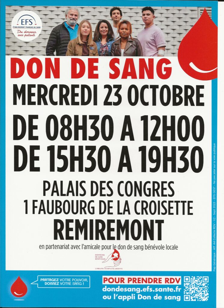 L’établissement français du sang et l’association des donneurs de sang bénévoles Remiremont et alentours organisent une collecte de sang le 23 octobre au Palais des congrès de Remiremont.